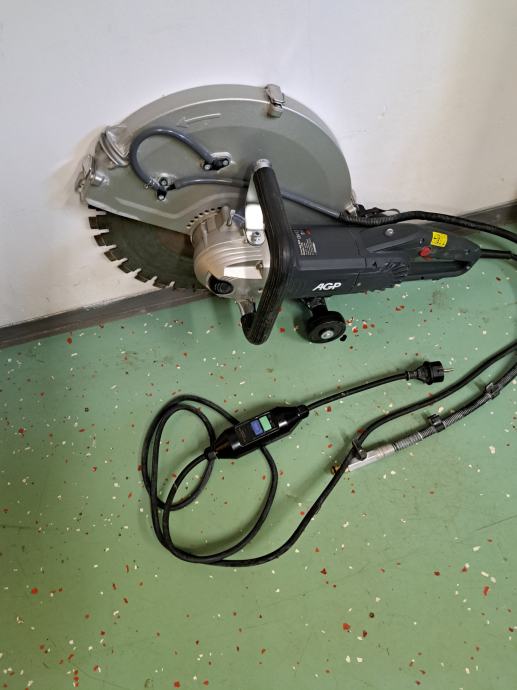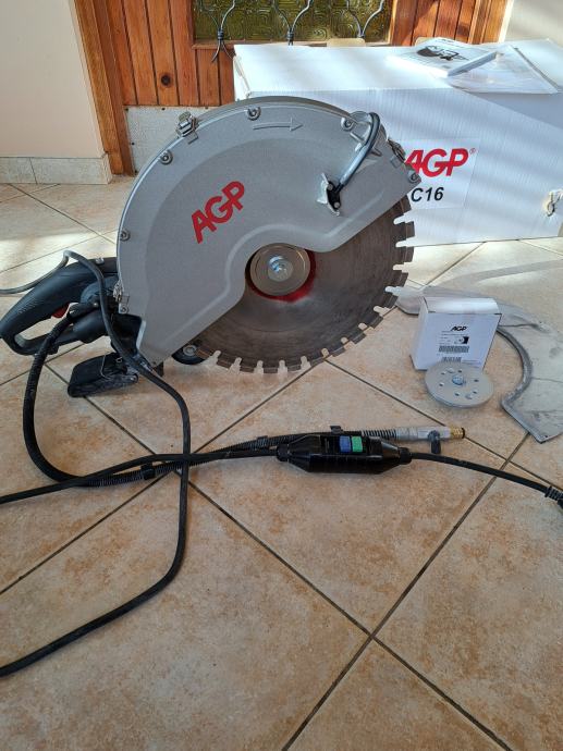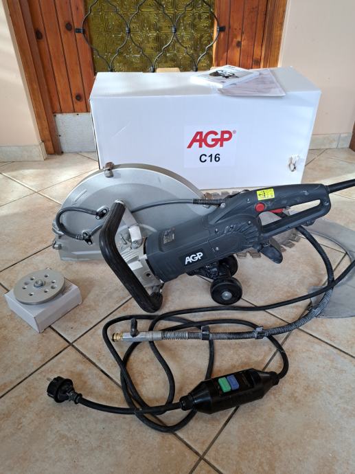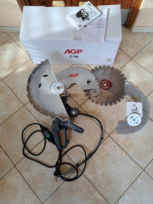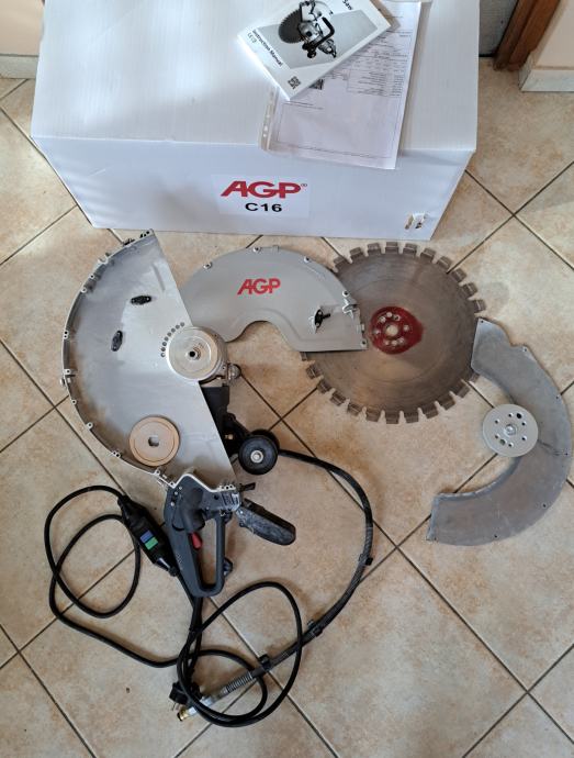 Prodajem profesionalnu pilu model AGP C16 za rezanje armiranog betona, kamena, cigle na vodu ili suho piljenje. AGP je Taiwanska kompanija i alat je zaista profesionalan (iako nije razvikan kao neke marke). Imate zastupnika u Hrvatskoj i nekoliko servisa (kao i po cijeloj EU). Uz pilu prodajem i prirubnicu za poravnato rezanje (ona služi za rezanje milimetar uz zid ili pod i kome to treba je veliki plus). Također na pili je ploča (niti ona nije hobby-bobby) sa 30 zuba promjer 40cm za piljenje armiranog betona. Ploča ima 6 rupa za zavrtanje na prirubnicu za poravnato rezanje i s tom pločom možete piliti i bez vode tj na suho. Primjer piljenja uz zid tj pod pogledajte link video koji sam dodao na kraju teksta. Ploča je potpuno ispravna i na njoj je potrošeno manje od 1mm vidije - sad ima oko 11,5 mm vidije na sebi. Pila je kupljena za jedan posao odraditi i meni se pokazala kao odličan alat. Pazim na alat i na njoj se vidi koliko je (ne)korištena te zaključno meni ne treba takav stroj u bližoj budućnosti (druga sam branša... unajmit ću je od Vas:). Po performansama i mogućnostima je ispred konkurenata.