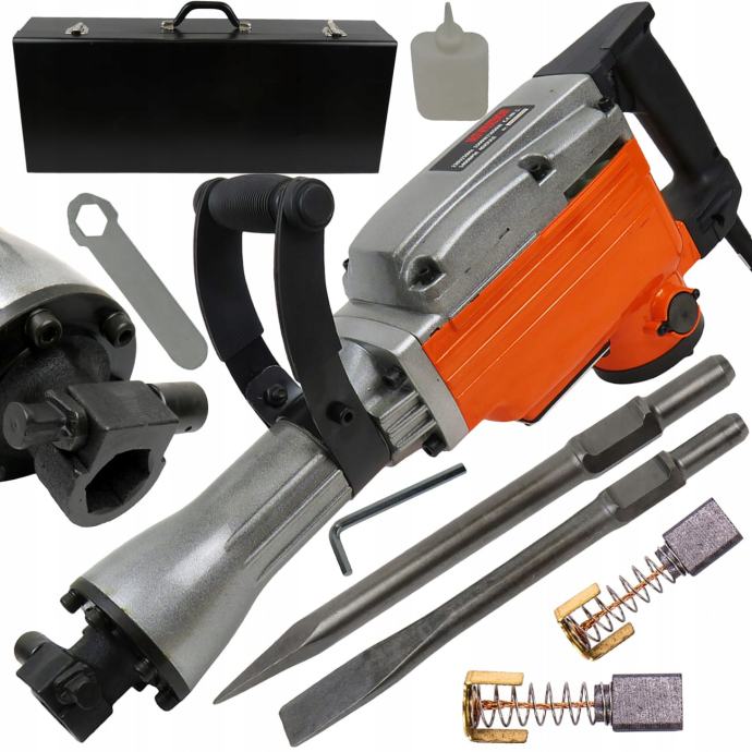 Strujni čekić bušilica je predviđen za zahtjevne popravke i izgradnju, izuzetno velike snage udarca čime razbija beton i ruši zidove. Udarni čekić s dinamičnom i kompaktnom izvedbom, izrađen od čelika i aluminija. Sadrži komponente za maksimalnu snagu i izdržljivost u stalnom pogonu. Ergonomska ručka s mekanim završetkom osigurava jednostavno manevriranje uređaja. Sustav protiv vibracija smanjuje umor operatora. Dolazi u kompletu zajedno sa 2 SDS dlijeta, ravnim i šiljastim.