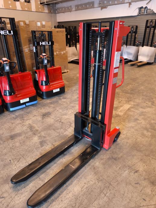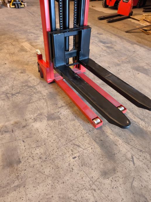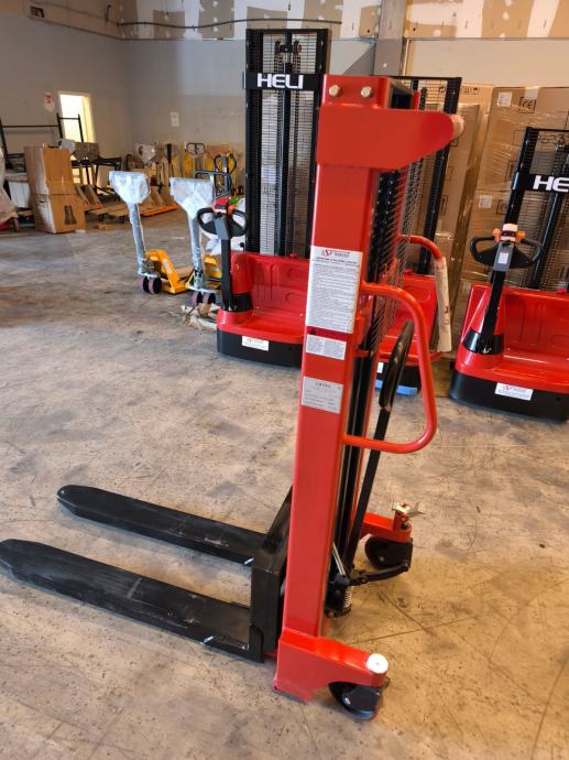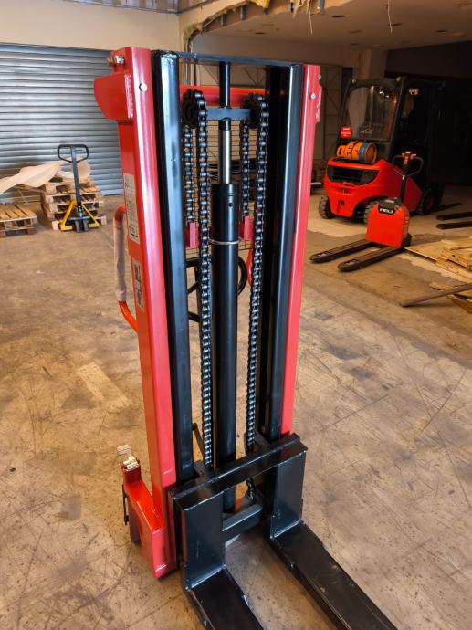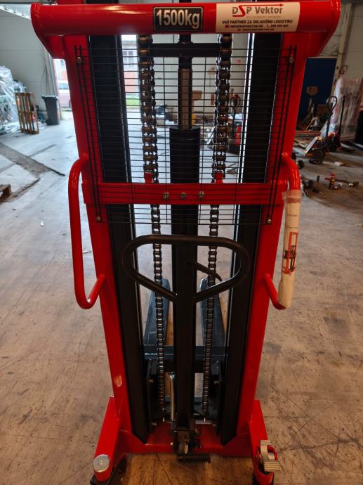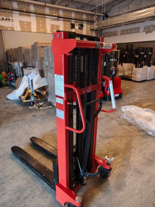 Nosivost stakera iznosi 1000 kg, dok maksimalna visina dizanja doseže 2000 mm, što omogućuje rad s robom na višim policama ili regalskim sustavima. Kombinacija ručnog i nožnog podizanja pruža fleksibilnost pri radu – nožni pogon je praktičan za brže podizanje, dok ručni omogućuje precizniju kontrolu tereta. Ova dvostruka opcija dodatno olakšava rukovanje u različitim situacijama i radnim uvjetima.