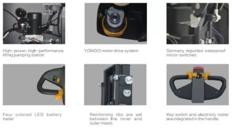Iako je ekonomičan električni viličar, još uvijek je opremljen velikom i visokom snagom. izvedbena pumpa za podizanje, koja osigurava dobro podizanje.