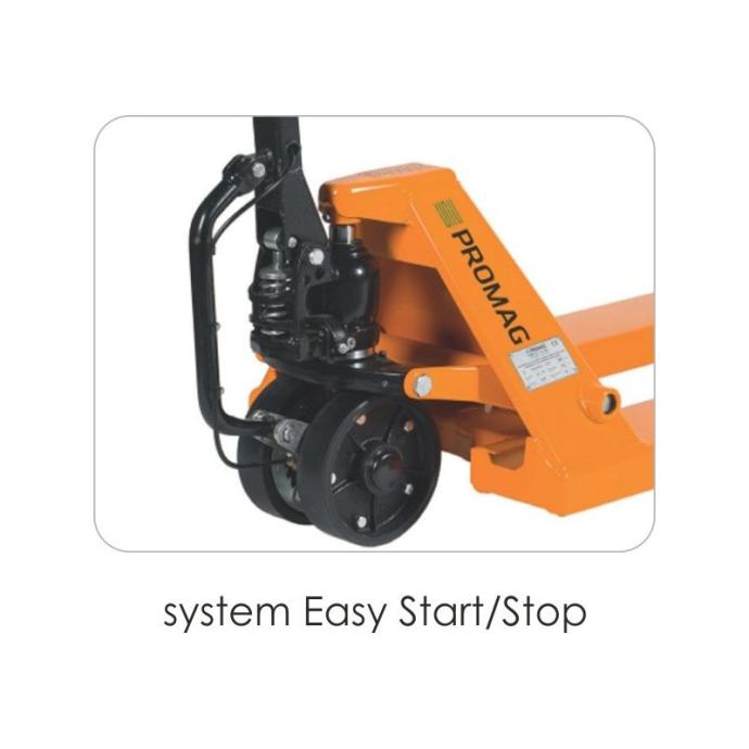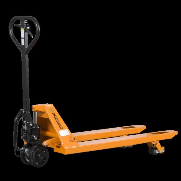 jednostavno upravljanje paletnim viličarom pomoću polugeveliki kut zakreta poteznice s upravljačima: 180°ergonomska ruda (napomena: oblik i završetak rude mogu se razlikovati od prikazanog na slikama)preljevni ventil koji štiti kolica od preopterećenjahidraulika bez održavanjagumeni kotači na poteznicivaljci vilica: dupli poliuretanski valjci (PT)paletna dizalica premazana prahom narančasto RAL 2011model u verziji s integriranim mehanizmom Easy Start/Stop s dvostrukom funkcijom, koji podržava vožnju paletnog viličara preko pragova i omogućuje mu da uđe na rampuEasy Start/Stop sustav omogućuje i zaustavljanje na nagibimaTehnički opis: Tip:PRA 2500/1150G/PTIzvedba: standardna 1 kolicaBoja: narančasta RAL 2011Jamstvo: 1 godinaTežina:59 kgvisina vilica: 85 mmVisina kotača: 180 mmVrsta kotača: G/PTElektrični/automatski pogon: neŠirina vilice: 150 mmElektrični viličar: neVentil za preopterećenje: daKut rotacije: ruda: 180 °Nominalna nosivost: 2500 kgDužina vilice: 1150 mmVučni kotači: gumeniViličasti valjci: dupli poliuretanski valjciVisina dizanja: 200 mmVanjska širina vilice: 550 mmU ponudi su i viličari nosivosti 2000 kg s mehanizmom za pomoć pri startanju - nazovite našeg savjetnika.]]>