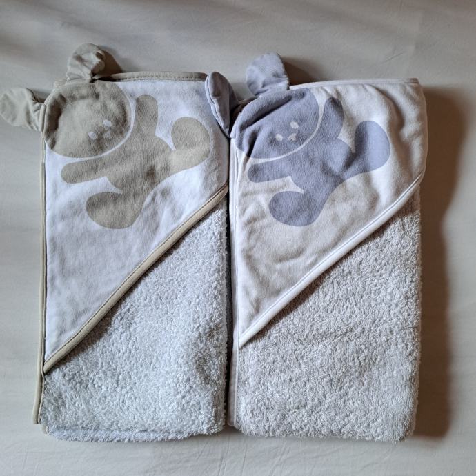 Benetton ručnici za bebe 2 komada s kapuljačom od mekog frotira od čistog pamuka. Dimenzije 75×75. Malo korišteno. Cijena za 2 komada je 20EUR.