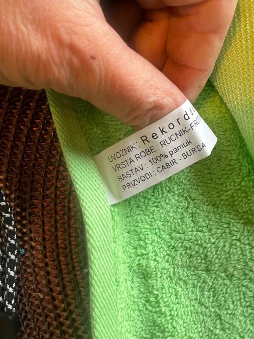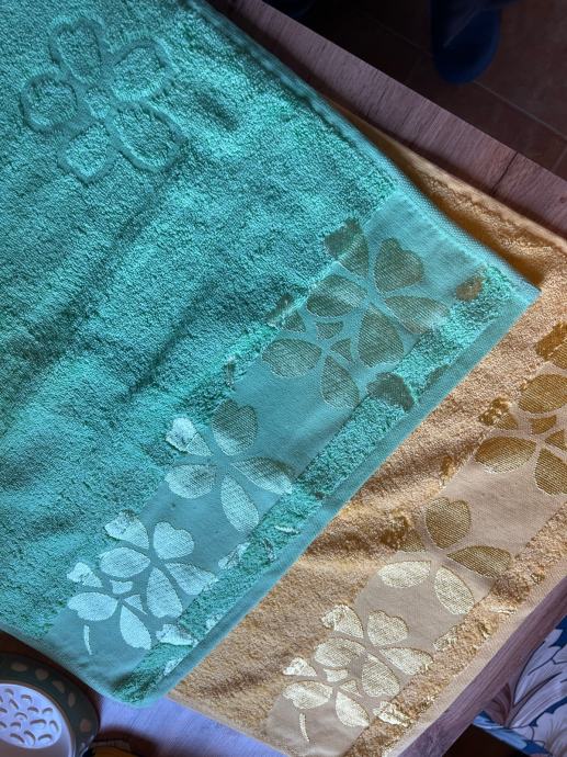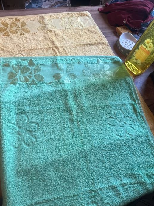 Prodajem nove ručnike marke Rekord, izrađene od 100% pamuka. U setu su dva ručnika – jedan žute i jedan zelene boje, s dekorativnim uzorkom. Uz ručnike dolaze i posuda za sapun te šampon za kosu s ekstraktom kamilice (1L), neotvoreni.