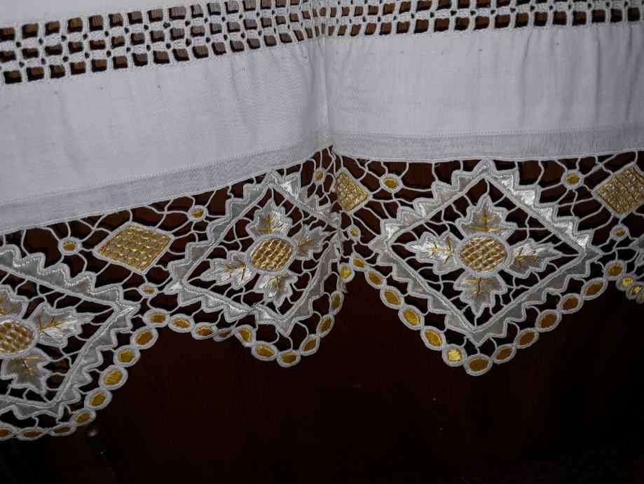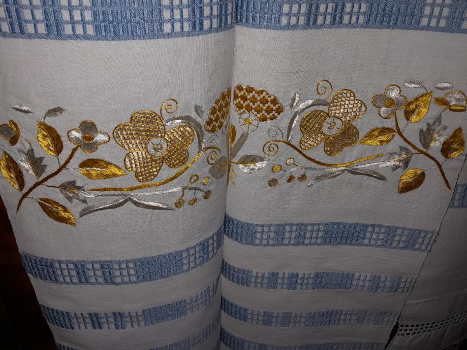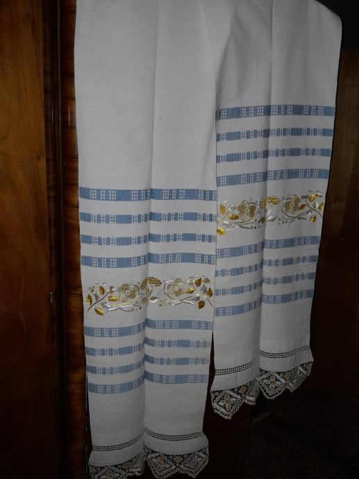 0vaj posebno lijep slavonski ručnik star je oko 100- 120 god ; obiteljska ostavština. Nije korišten i dobro je sačuvan . Izrađen je od domaćeg platna sa utkanim i vezanim uzorcima, te čipkom. Dimenzije su 375 cm x 42 cm. Kontakt 091 33 11 773.