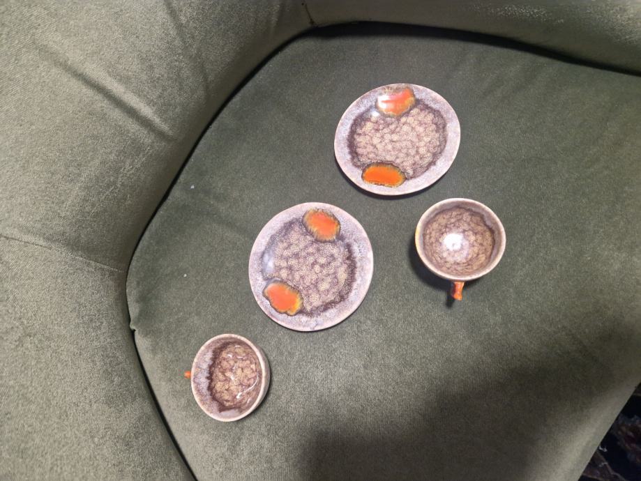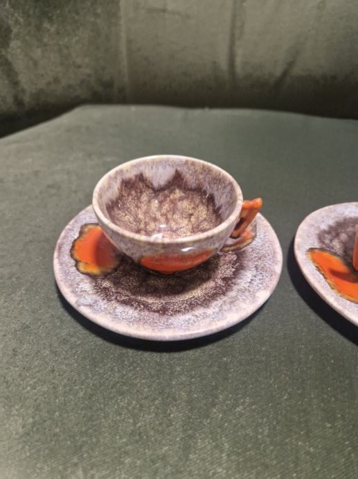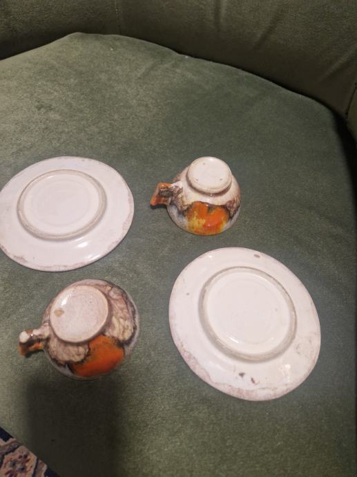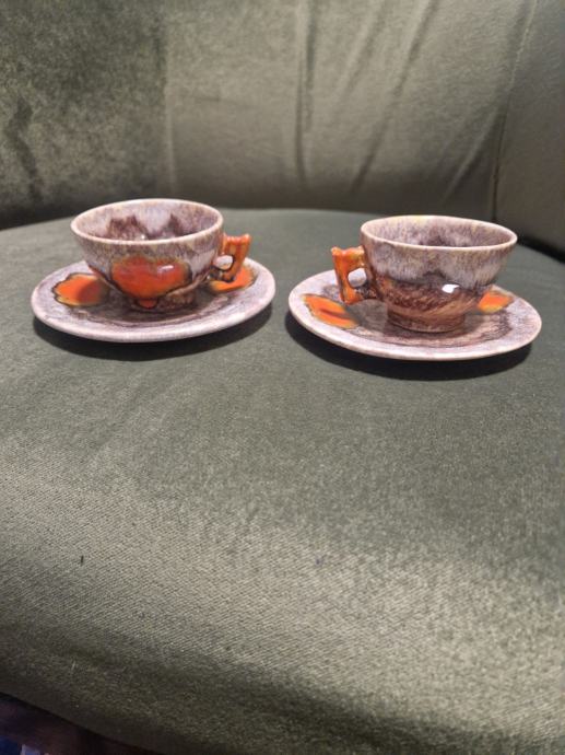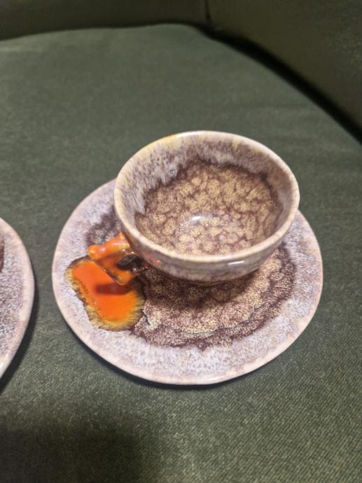 Odlične i kao ukras :) super stanje, neokrhnute, stari ručni rad iz 80-ih. Promjer tanjurića je 11 cm, otvor šalice 6 cm a visina 4 cm. Dakle male lijepe šalice za crnu kavu :) cijena za oba komada.