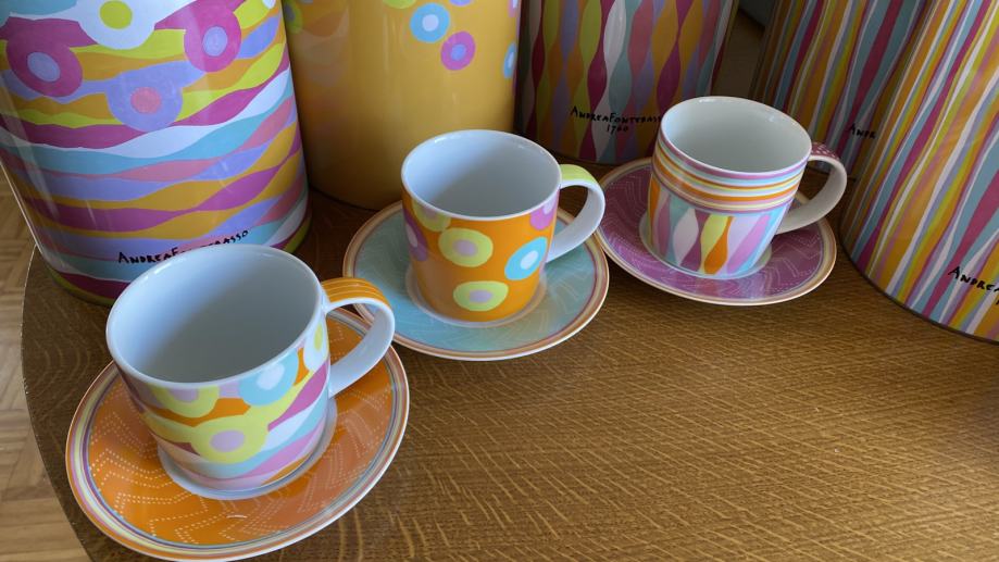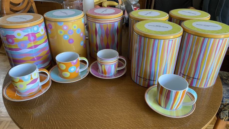 U svakoj limenoj kutiji je set od 2 iste šalice sa tanjurićima.
