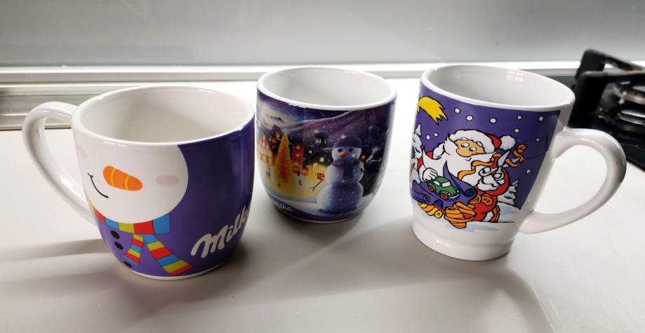LOT 3 kom Milka božičnih šalica, 1 je nekorištena, 2 su korištene par puta. Mogućnost pojedinačne kupnje