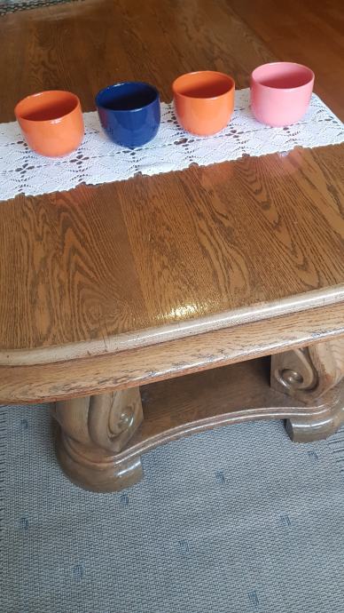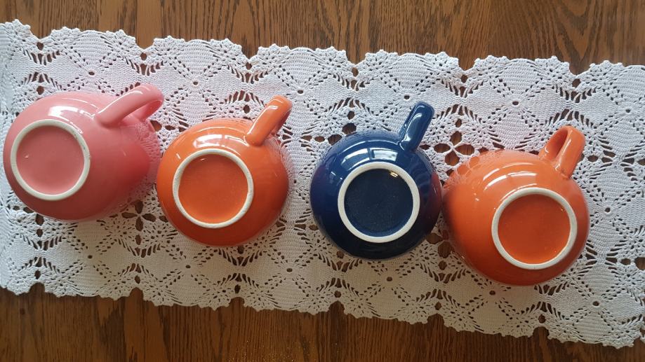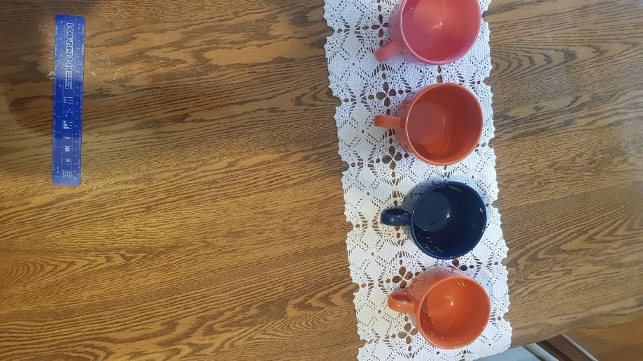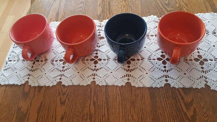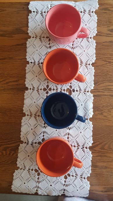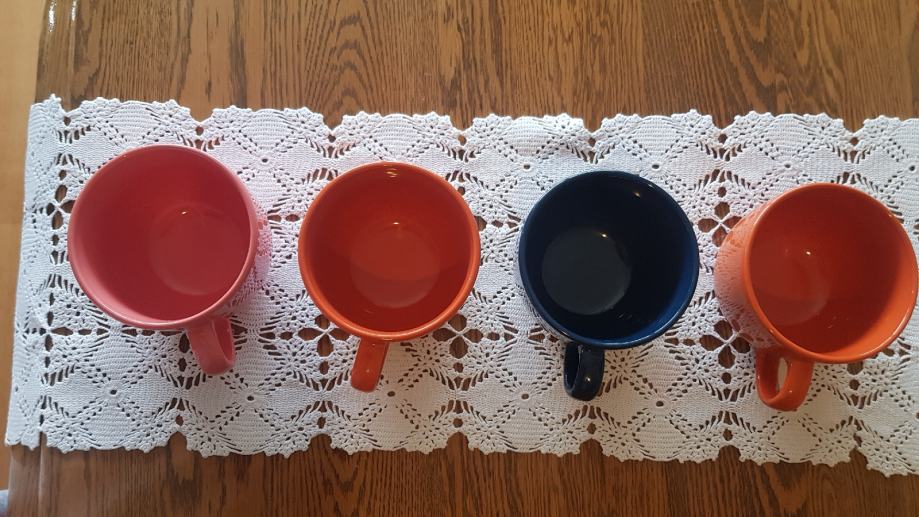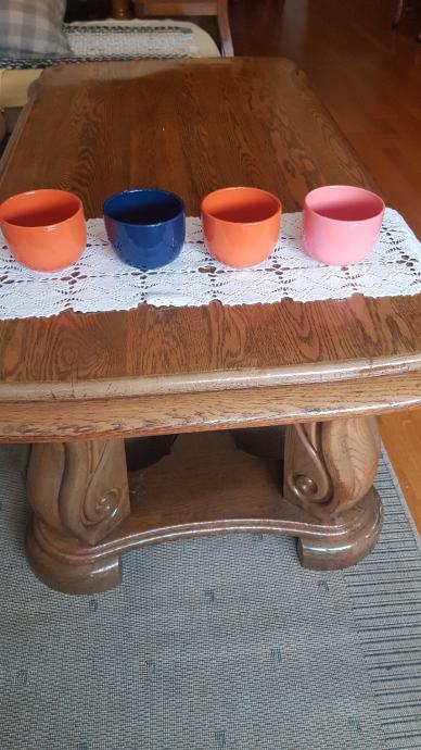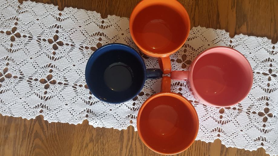 Set lijepih raznobojnih šalica. Plava za tatu, roza za mamu i dvije naranđaste za djecu. Potpuno nove, prikladne za jelo kao i zdjelice. Visokog sjaja. Promjer R=10cm, visina =8cm.