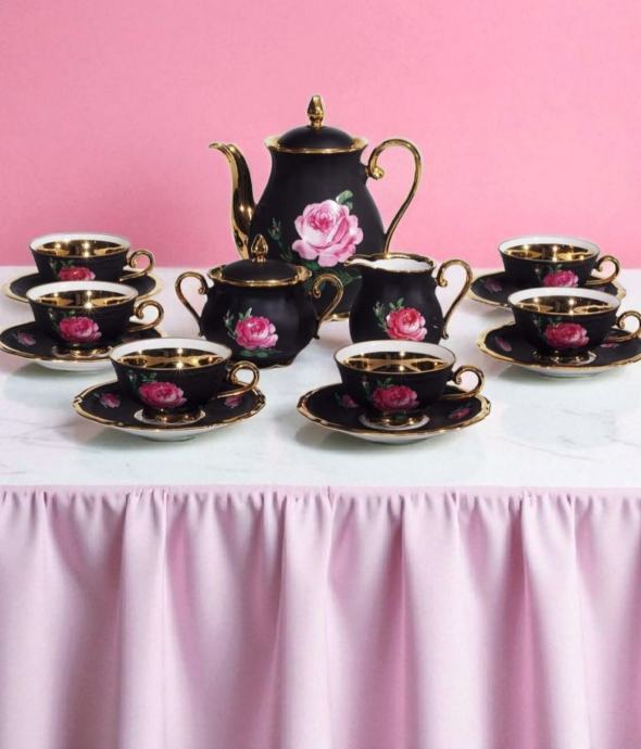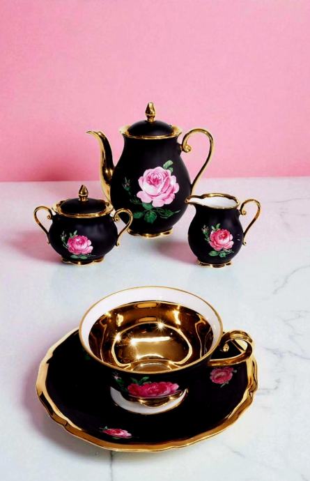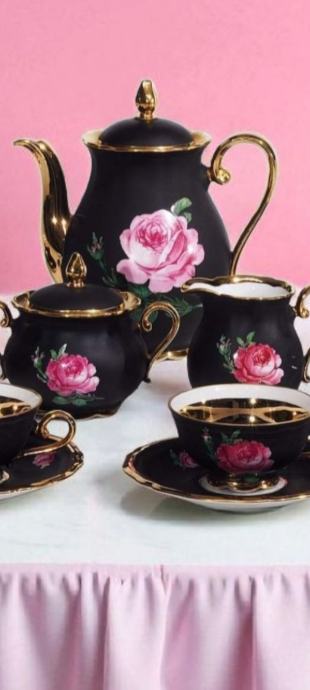 Na prodaju rijedak porculanski set Marie Luise Seltmann Weiden. Elegantni crni dizajn s ružama i zlatnim detaljima( pozlata). Set se sastoji od 6 šalica s tanjurićima, čajnika, vrca za mlijeko i posude za šećer. Nekoristen u odlicnom stanju.