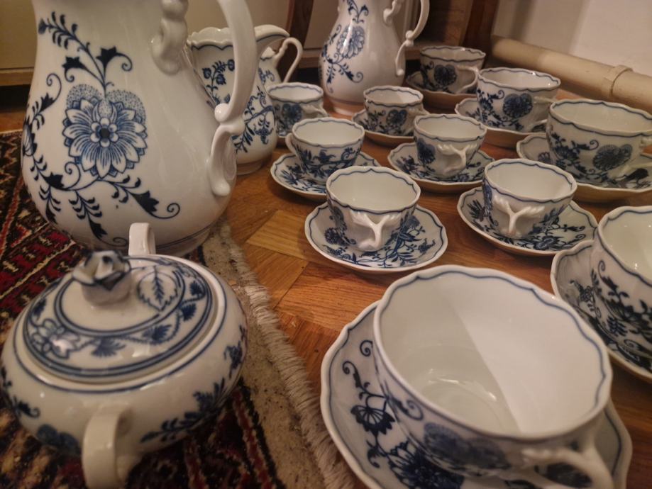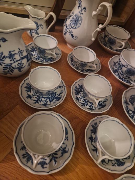 Uglavnom, 6 manjih šalica ( visina 5 cm, gornji promjer 7 cm) s pripadajućim tanjurićima ( 11 cm), posudice za mlijeko, kavu i šećer te 6 velikih šalica za čaj (visina cca 7 cm, gornji promjer cca 9 cm) s pripadajućim tanjurićima ( cca 14 cm), posude za šećer, mlijeko i čajnik.