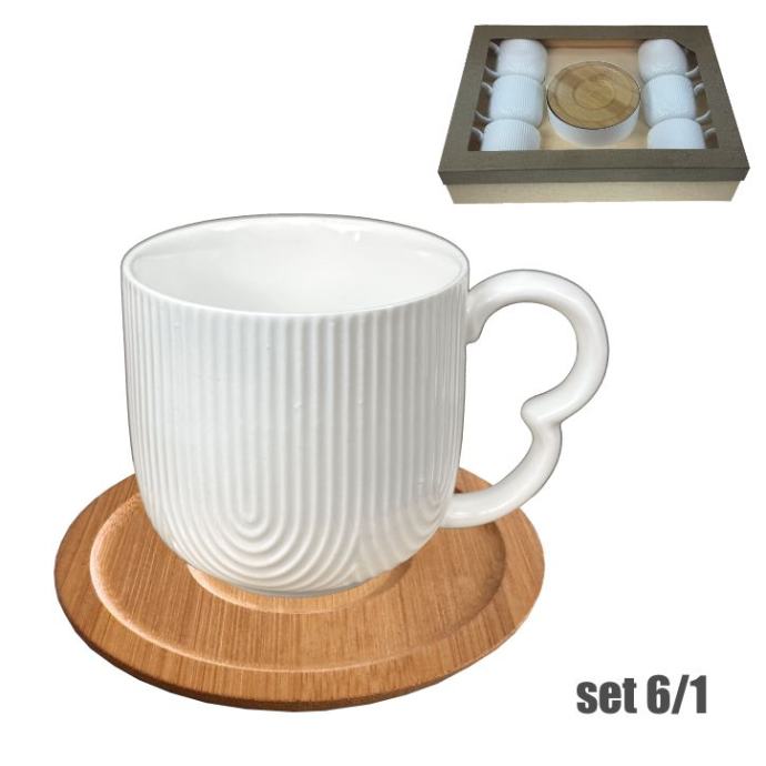 Set sadrži 6 porculanskih šalica sa drvenim tanjurićima