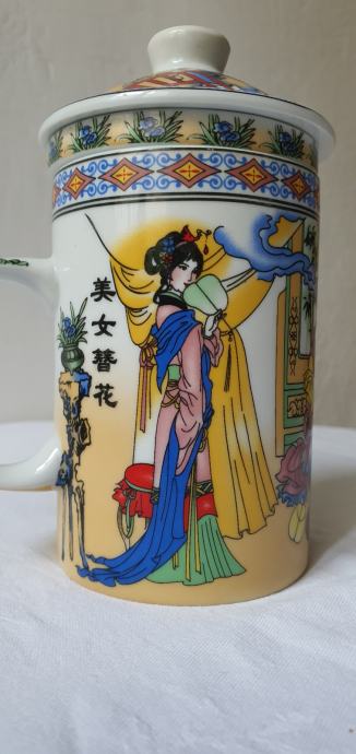 Vintage vrhunska porculanska šalica ručno oslikana sa motivom tri gejše te cjedilom i poklopcem