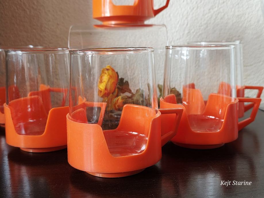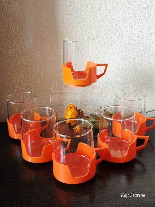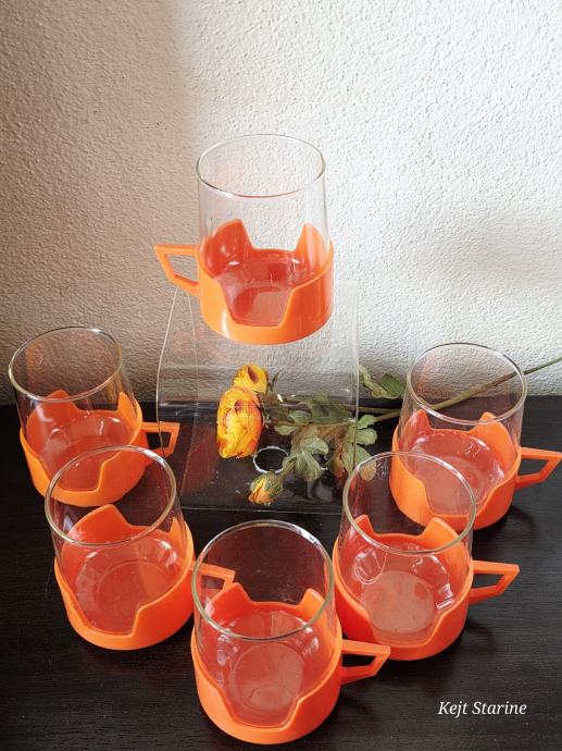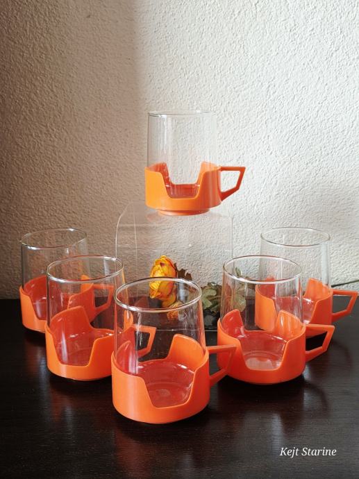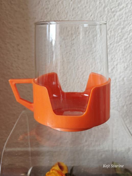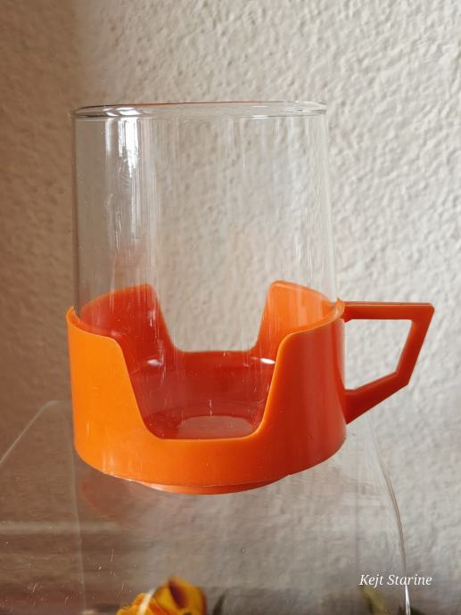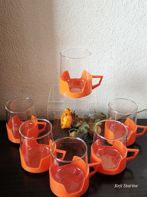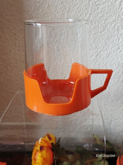 Vatrostalne staklene šalice s prepoznatljivim narančastim plastičnim držačima pravi su primjer vintage dizajna iz 1970-ih. Često se povezuju s brendovima kao što su Simax (Čehoslovačka) ili JAJ Pyrex (Engleska), a poznate su po svojoj izdržljivosti i otpornosti na visoke temperature.