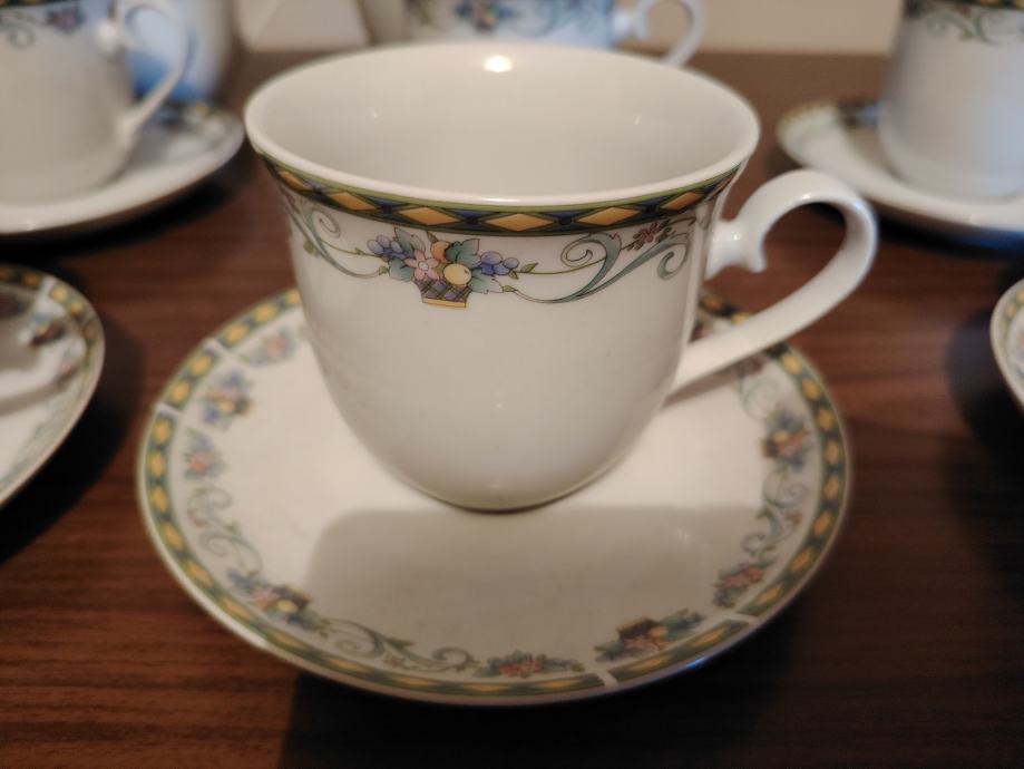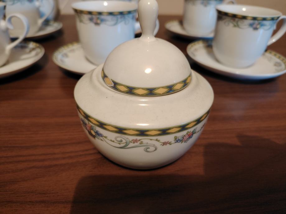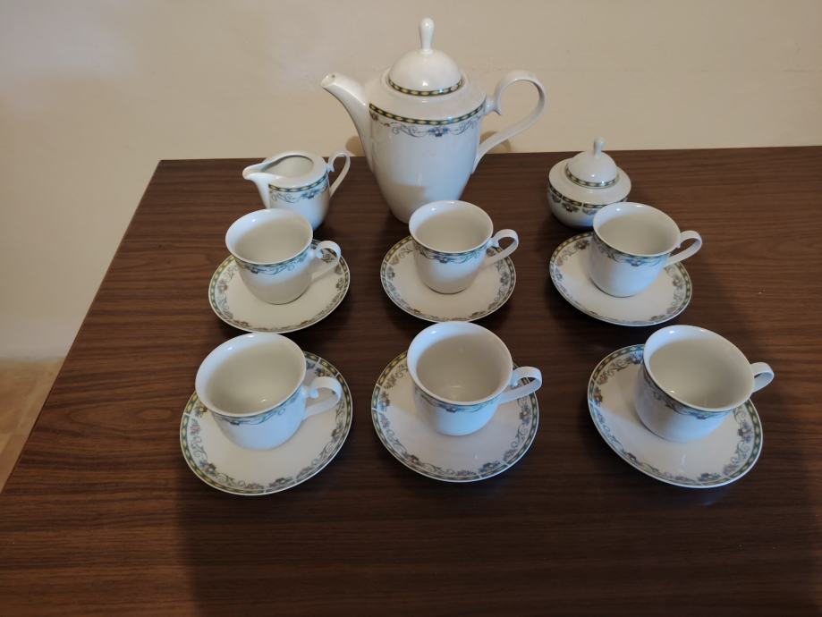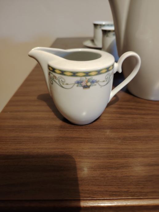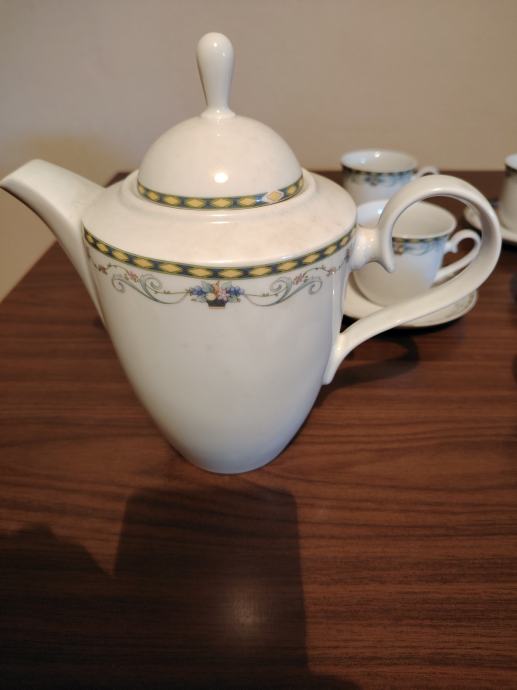 Šalice s tanjurićima, šećernica , čajnik i posuđa za mlijeko, nekorišten komplet.