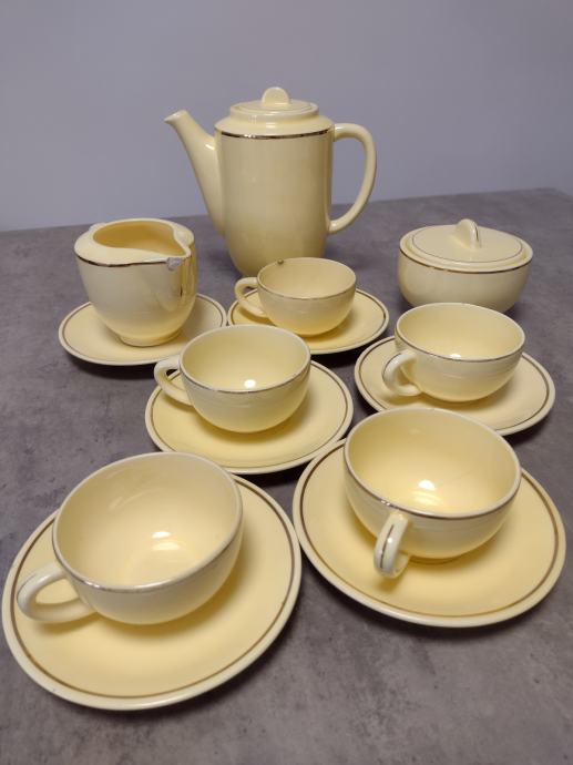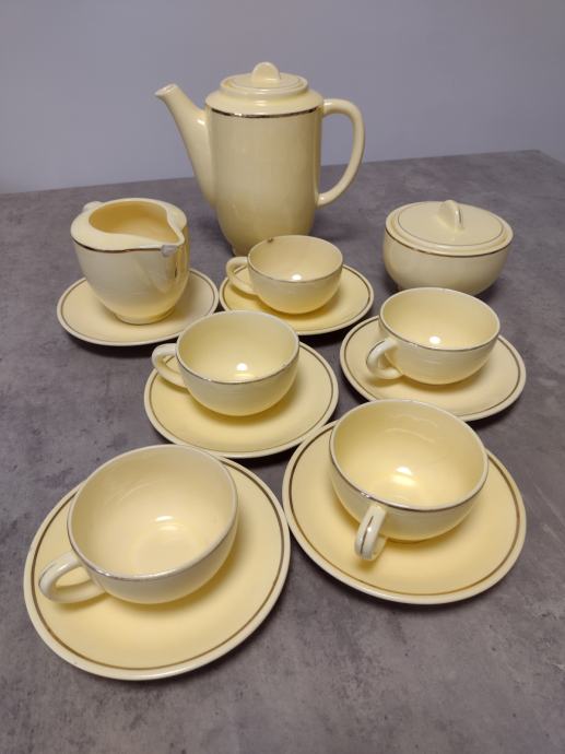 Šalice keramičke žute, set sa tanjurićima, 5 komada, posudica za šećer i mlijeko i čajnik