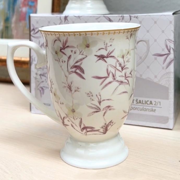 Rozo-ljubičasti cvjetovi s laganim listićima razlijevaju se po površini svake šalice poput akvarela – smirujuće, elegantno i romantično. Dekor odiše tišinom jednog mirnog jutra, svježinom proljetnog dana.