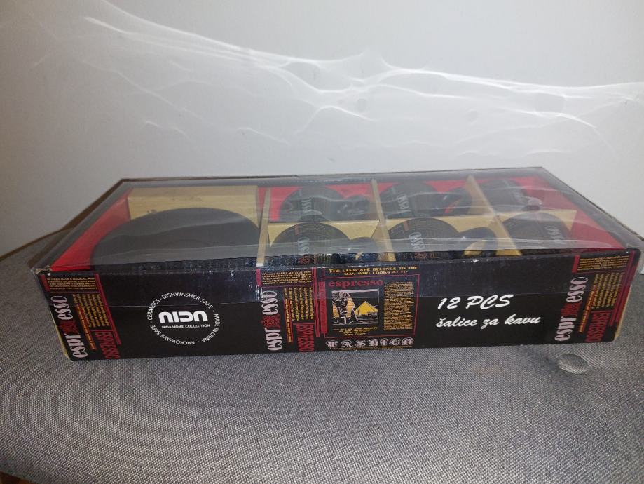 Prodajem keramičke šalice za crnu kavu.S vanjske strane su crne a s unutarnje strane su 3 kom.zelene a 3 kom.crvene boje.Tanjurići su crne boje.Set se sastoji od 6 tanjurića i 6 šalica.Novo.
