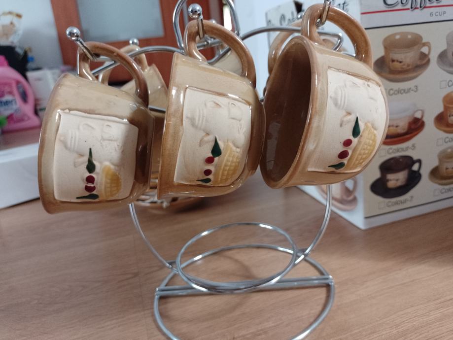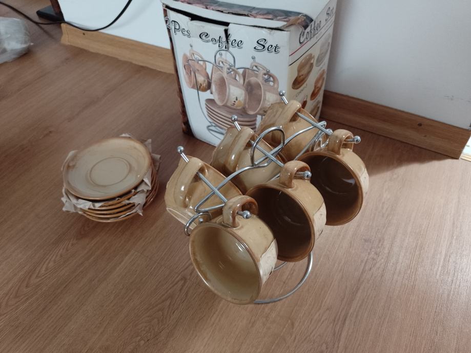 6 šalica s lijepim dizajnom i reljefnom slikom. 6 tanjurića i 1 stalak.Nekorišteno.