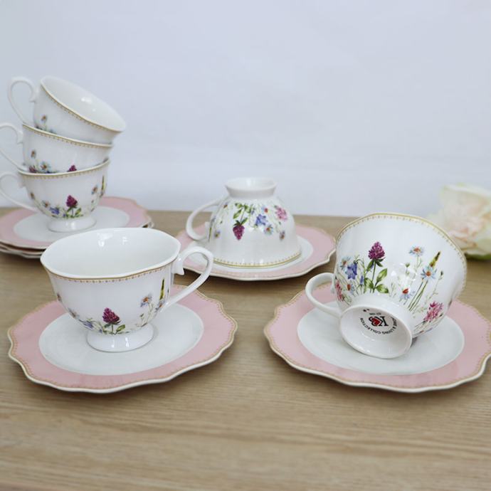 Ova kolekcija, koja uključuje 6 šalice i 6 tanjurića, oduševljava svojim romantičnim dizajnom – zlatni rubovi i živopisno livadno cvijeće u nijansama roze čine svaku šalicu pravim malim umjetničkim djelom.
