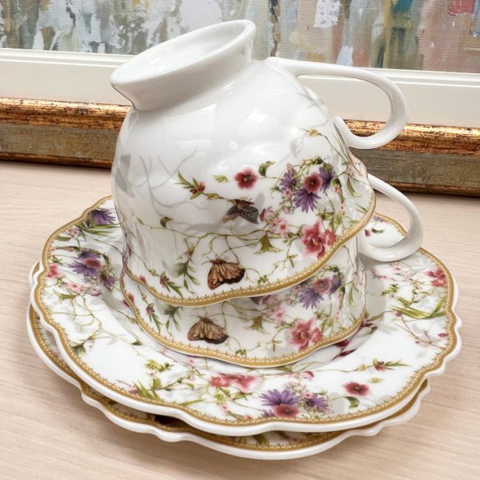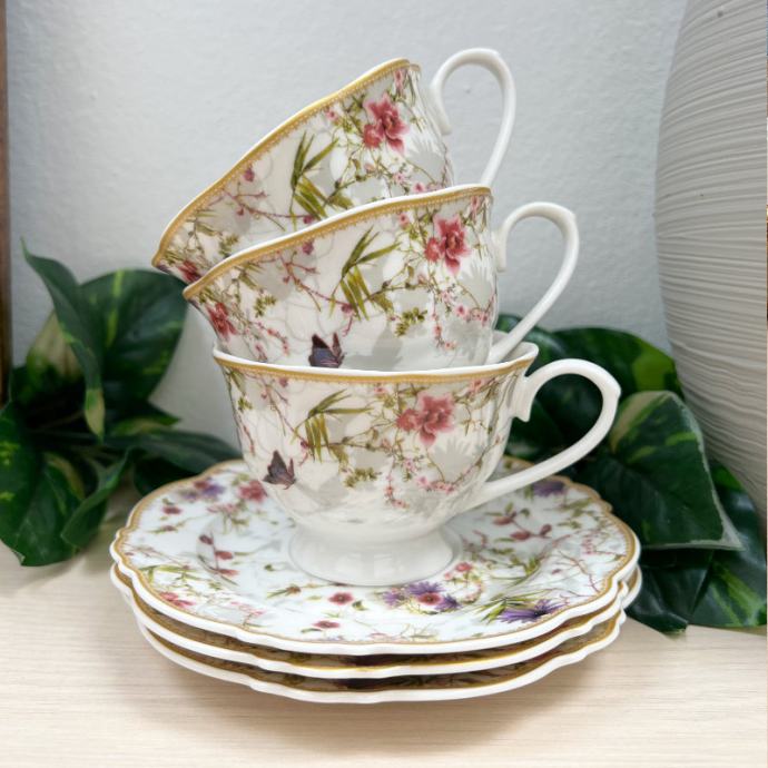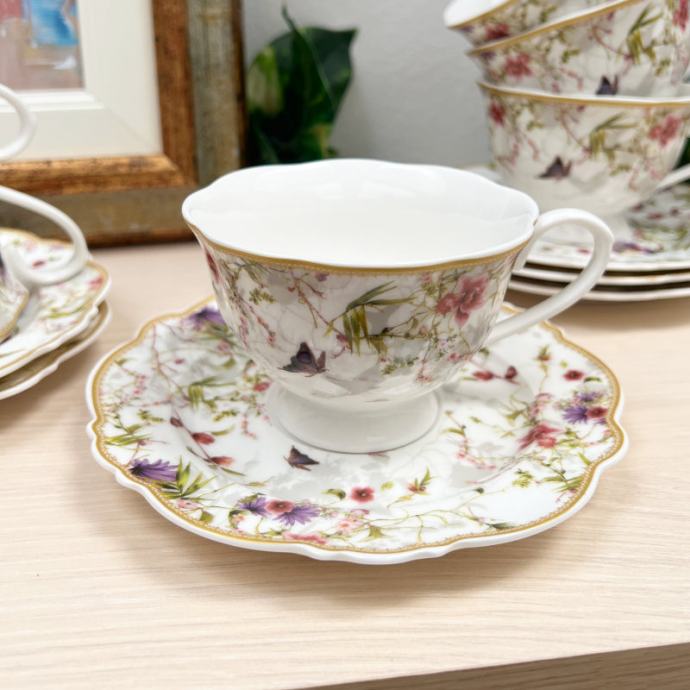 Svijetli, veseli cvjetovi i leptiri, uz zlatni rub, stvaraju sofisticirani i nježni ugođaj. Valoviti rubovi šalica dodaju vintage šarm, dok suptilan zlatni detalj čini ovaj set savršenim za posebne trenutke.