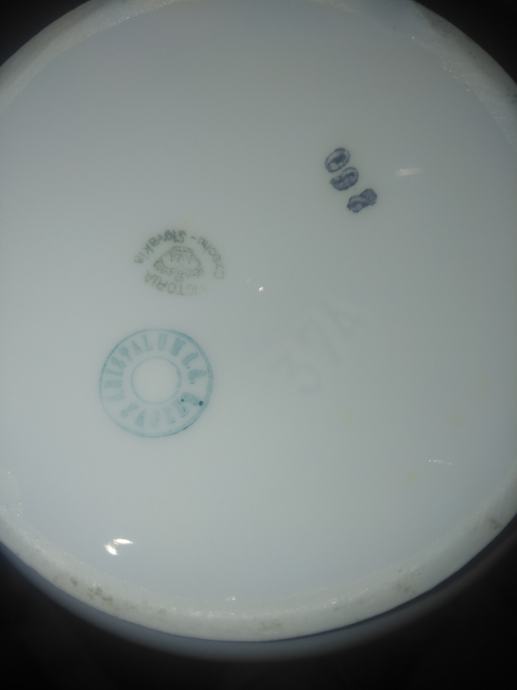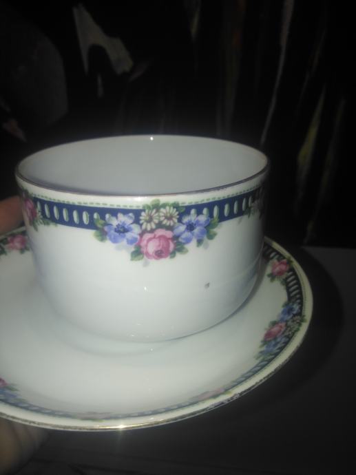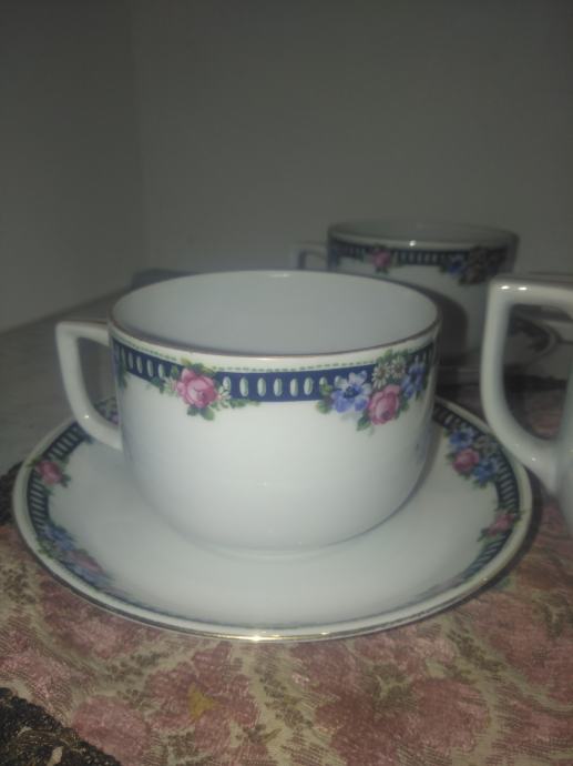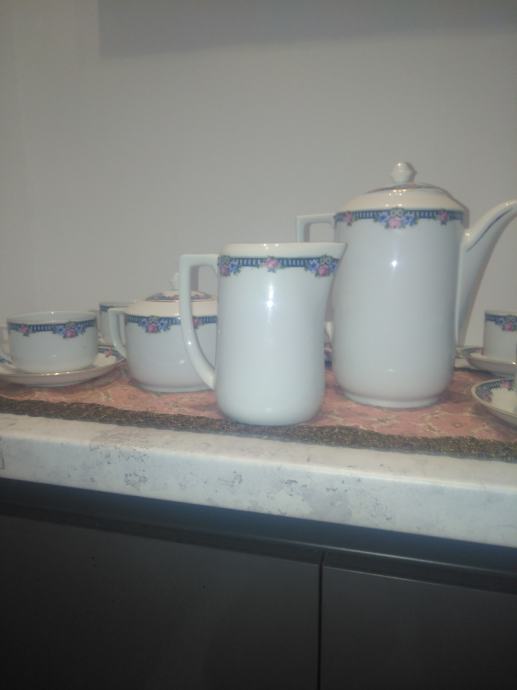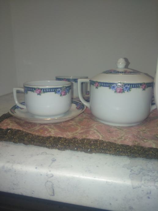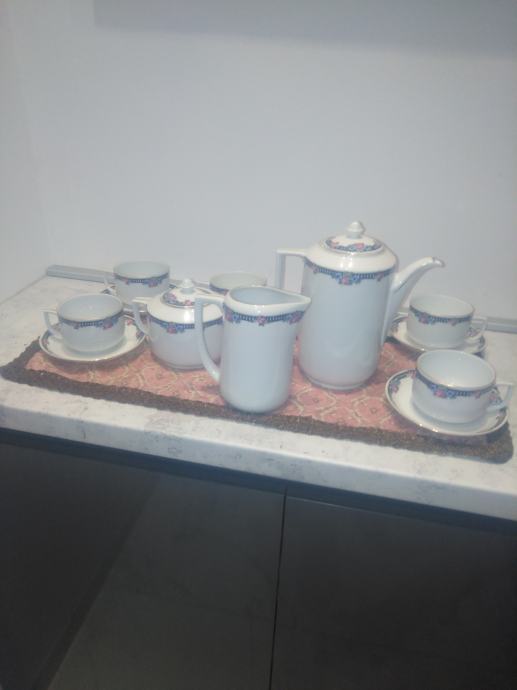 Kompletan porculanski servis iz cca 1920-ih godina koji se sastoji od 6 šalica s tanjurićima, čajnika, posude za mlijeko i šečer. Svi komadi u super stanju, ništa razbijeno ili okrhnuto ( što je rijetko :) ) a s obzirom da je nekorišten čak je i pozlata očuvana :)