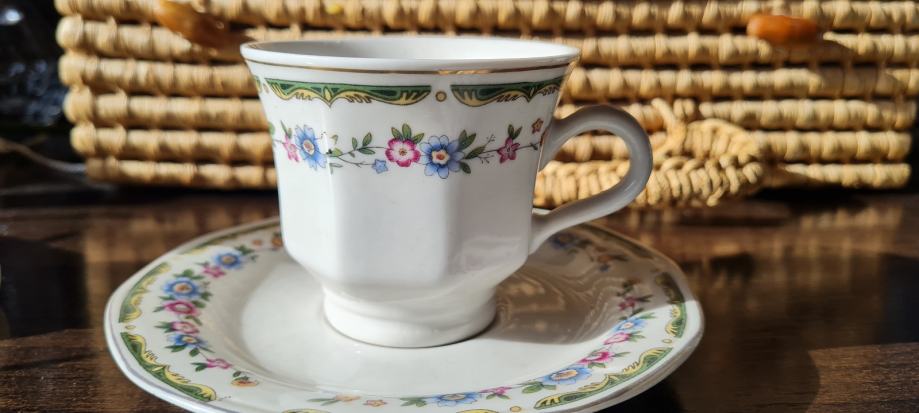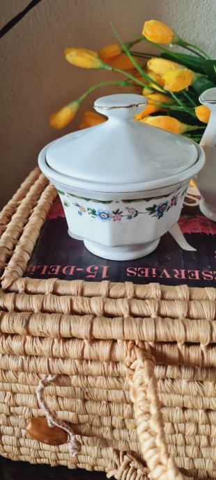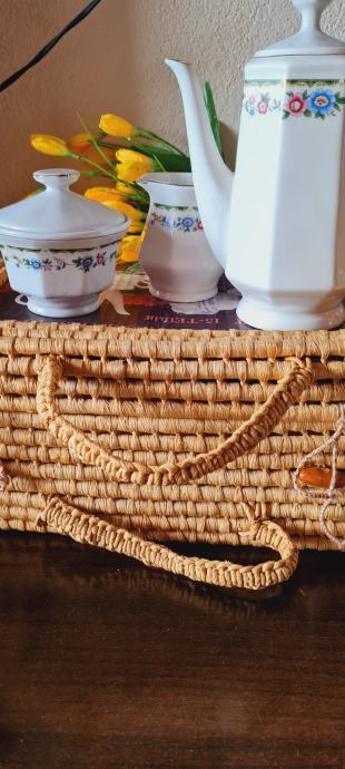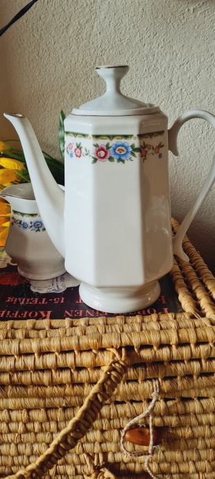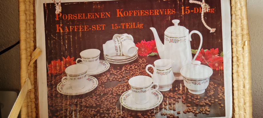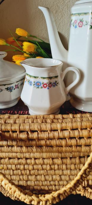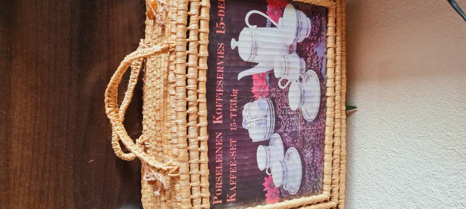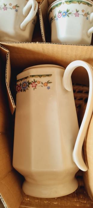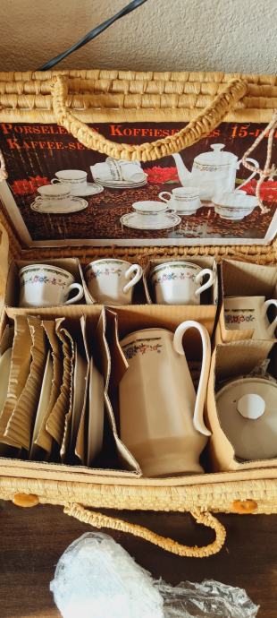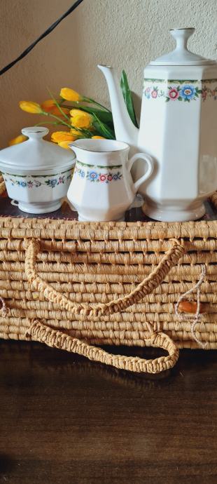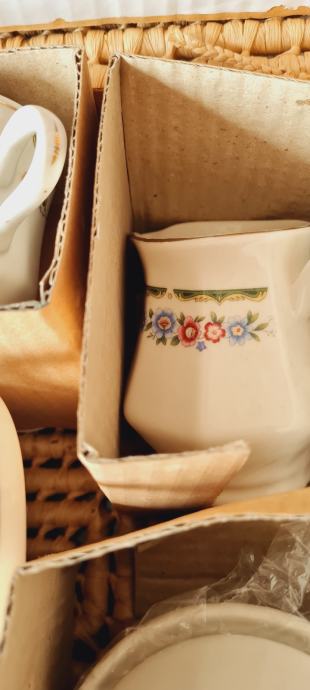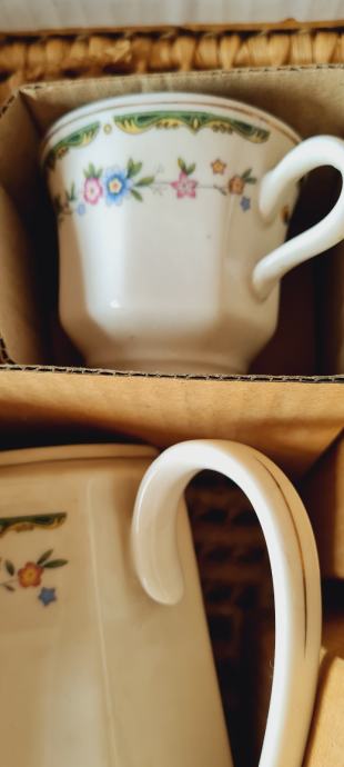 Servis u koferu, velike šalice, čajnik, šecernica i posuda za mlijeko