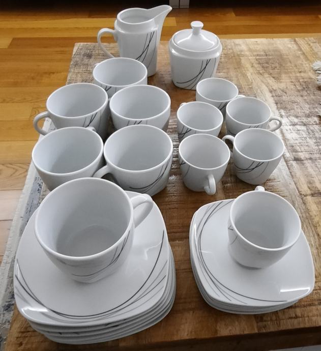 Prodajem očuvan set koji uključuje 6 malih šalica za espresso sa pripadajućim tanjurićima, 6 šalica za kavu sa pripadajućim tanjurićima, posudom za mlijeko te posudom za šećer. Sve je kao novo, neoštećeno. Moguća dostava na području Zagreba.