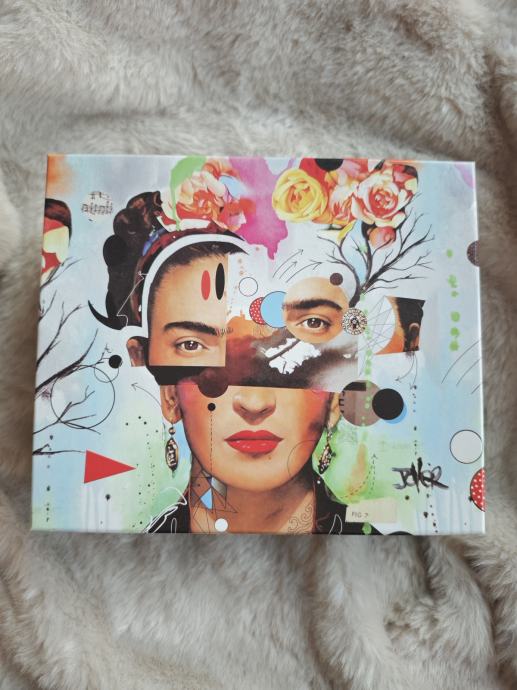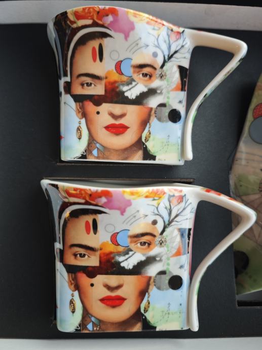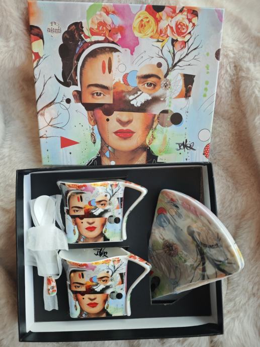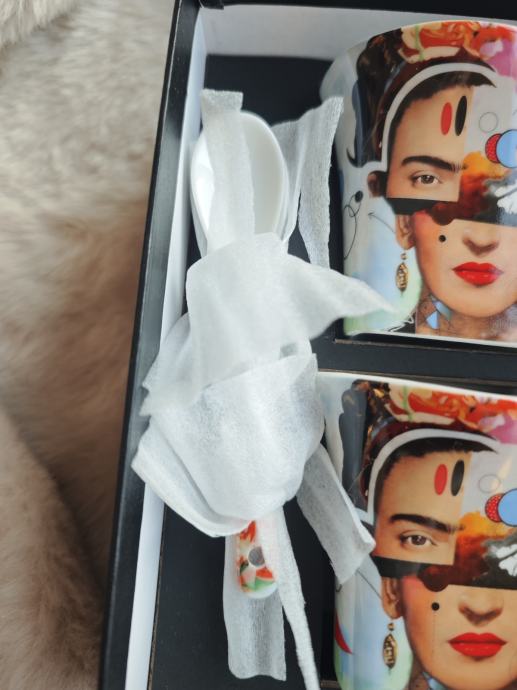 Set za kavu Frida Kahlo, 2 šalice, 2 tanjurića, 2 žličice, zapakirano u originalnoj kutiji, novo. Unutar kutije malo je poderan karton (na slici)