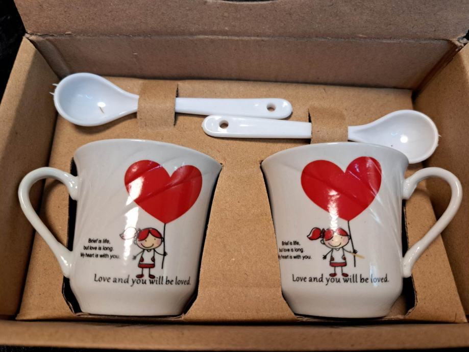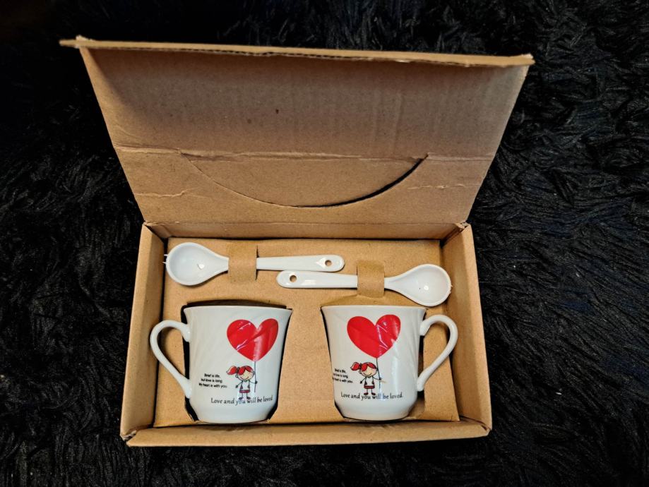 Set keramičkih malenih šalica sa dvije žličice, potpuno novo i zapakriano u kutiji. Lijepo za poklon, valentinovo...