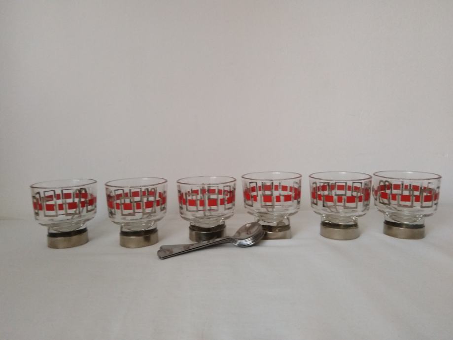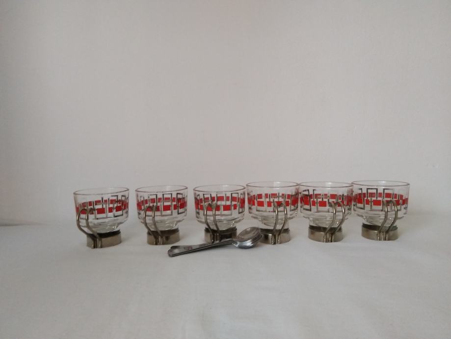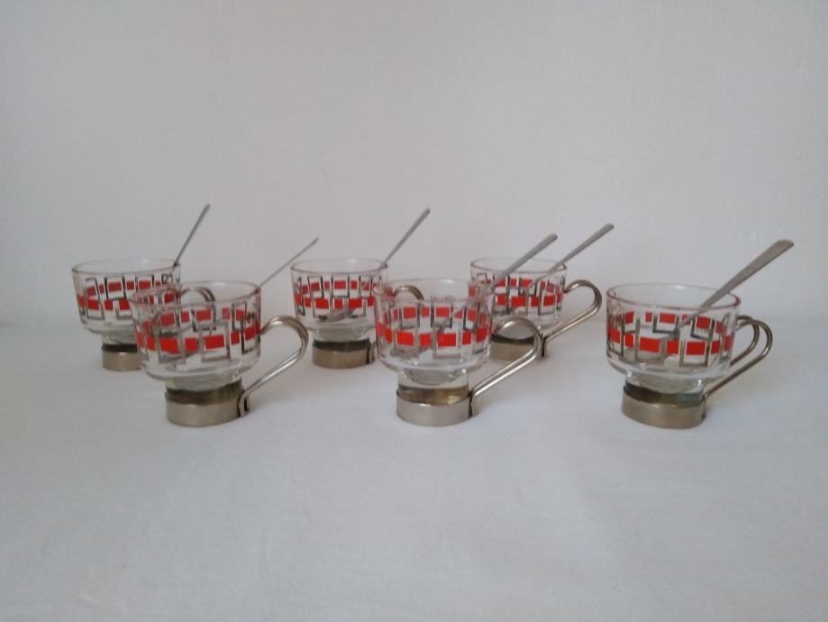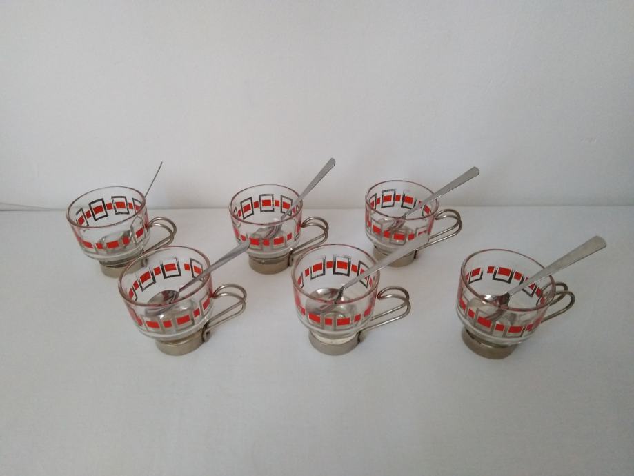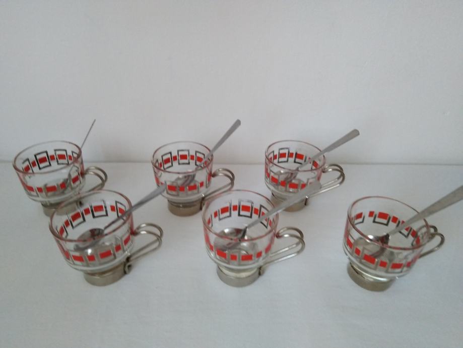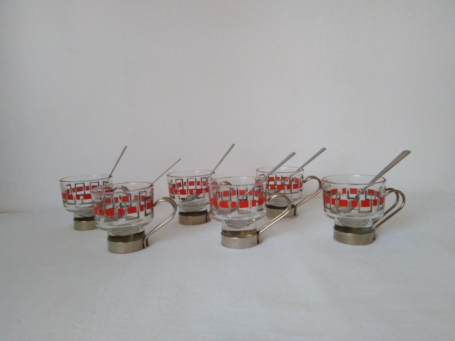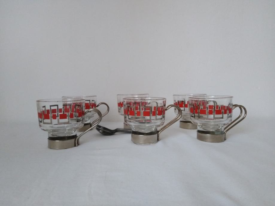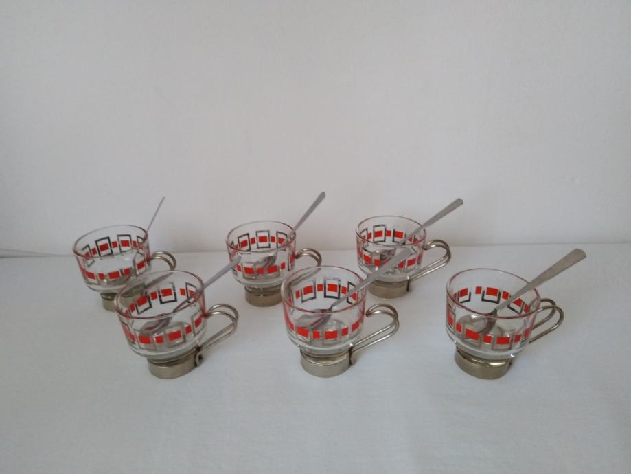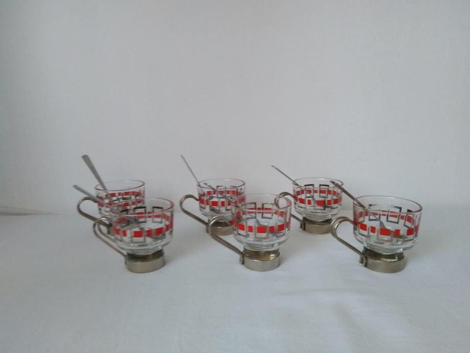 Vintage staklene šalice za kavu ili čaj sa metalnim držačima i žlicama