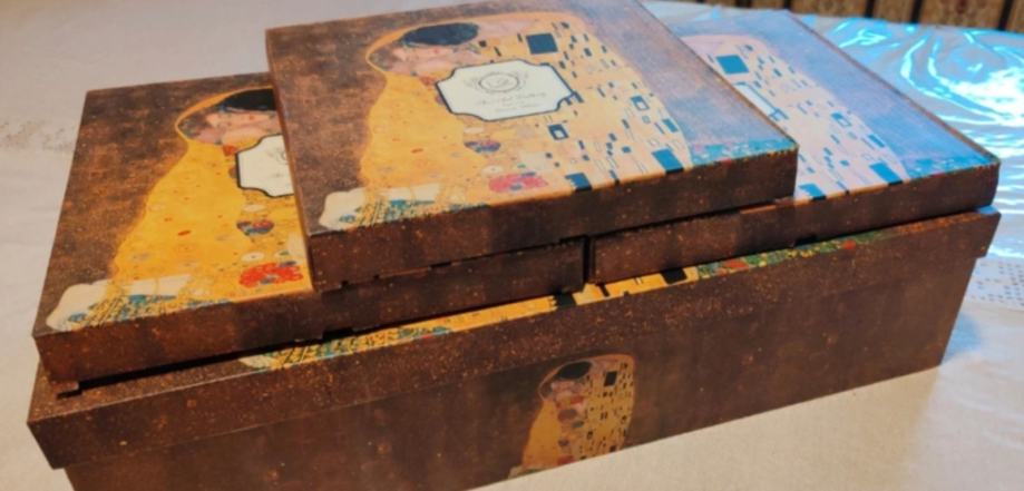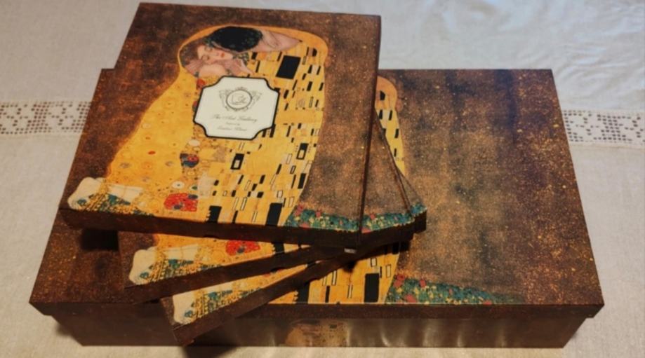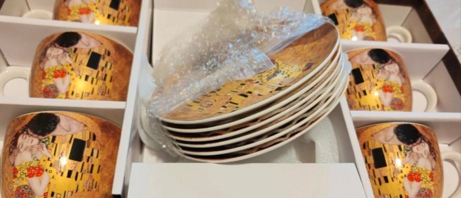 Originalni set Gustav Klimt (od The Art Gallery). Set se sastoji od manjih setova: jedan je set sa šest šalica sa tanjurićima, te tri dodatna seta od dva desertna tanjura. Ukupna vrijednost bi bila 120€.