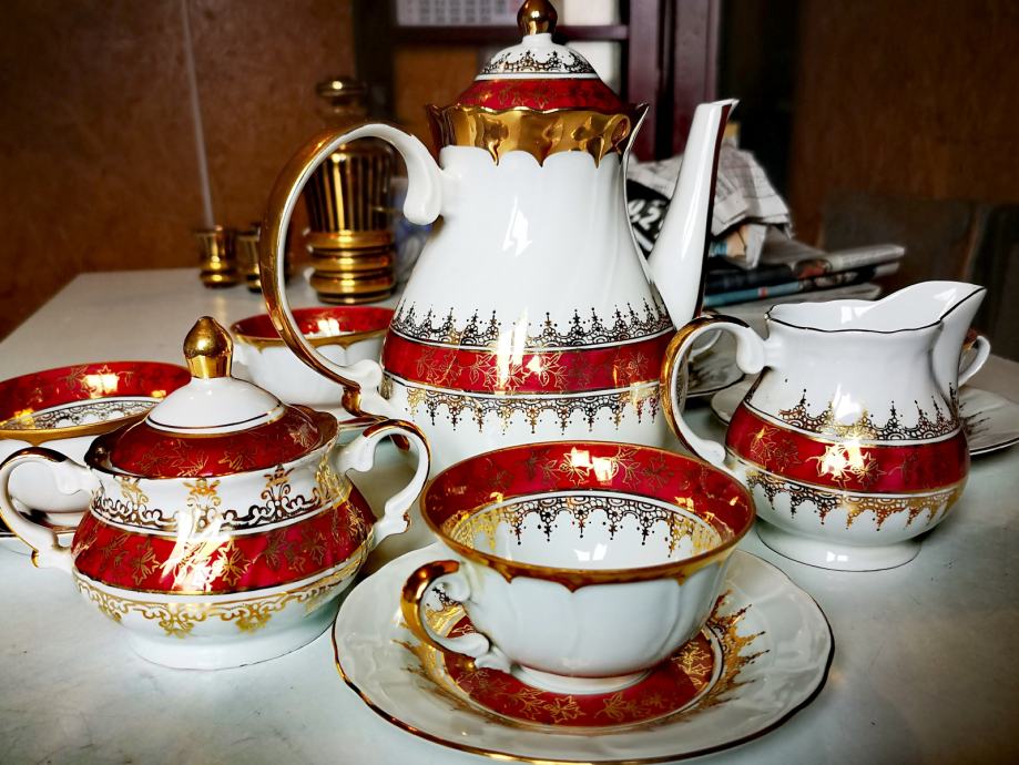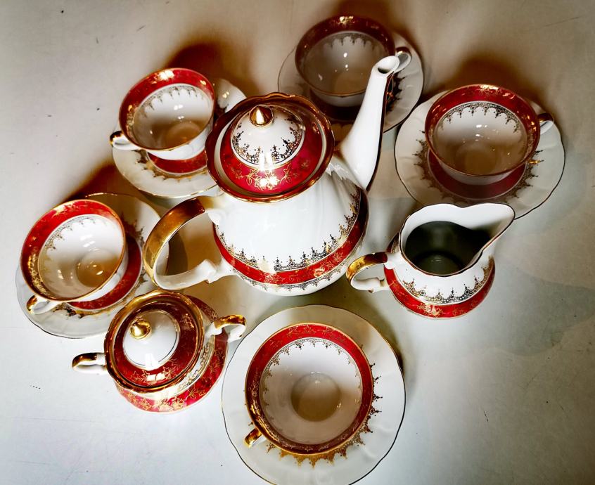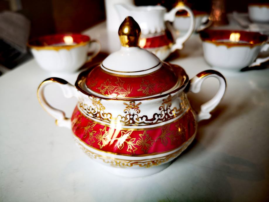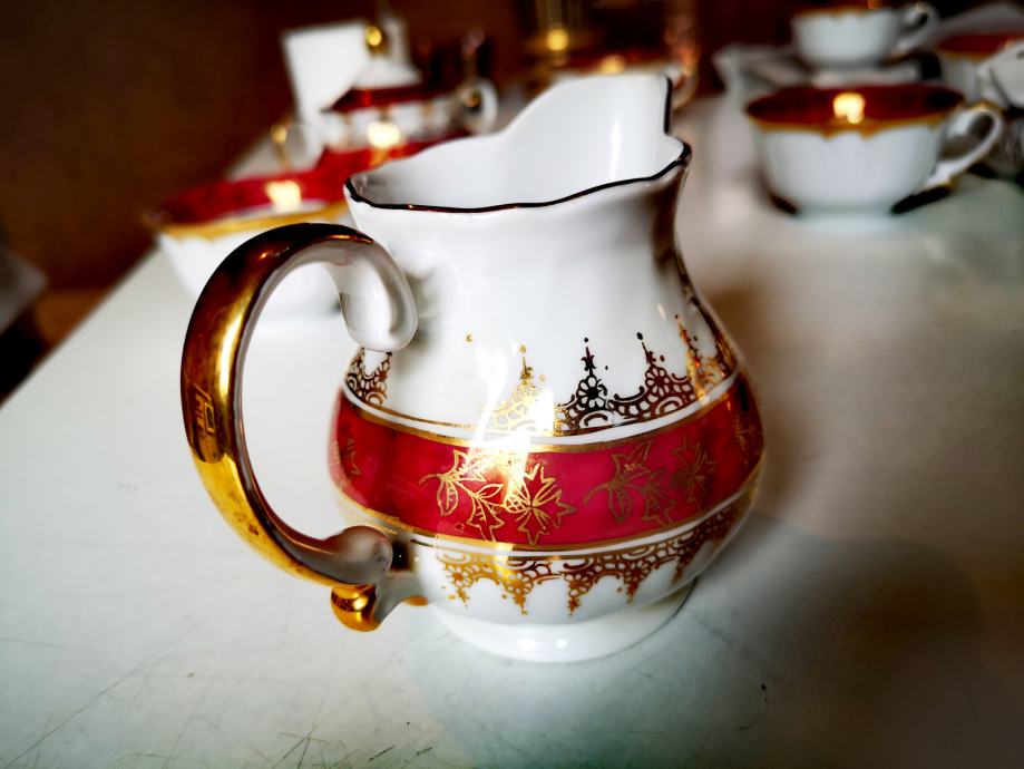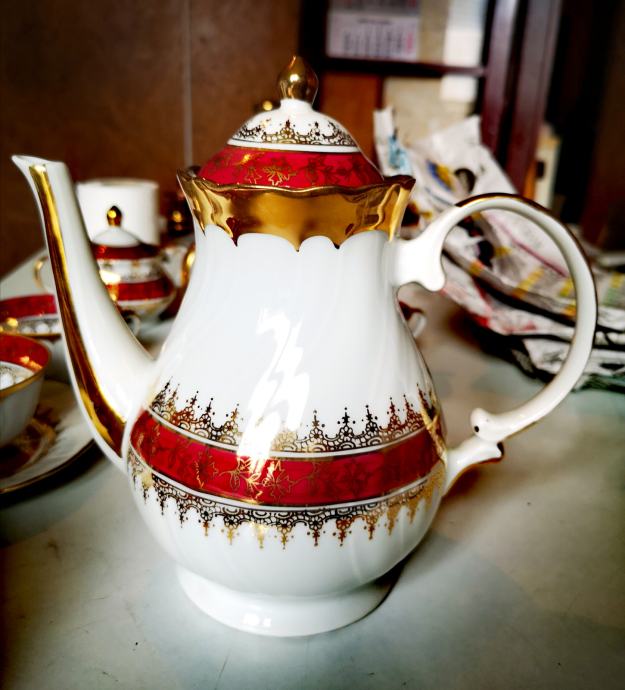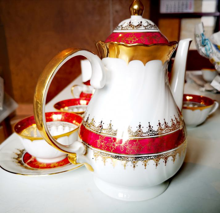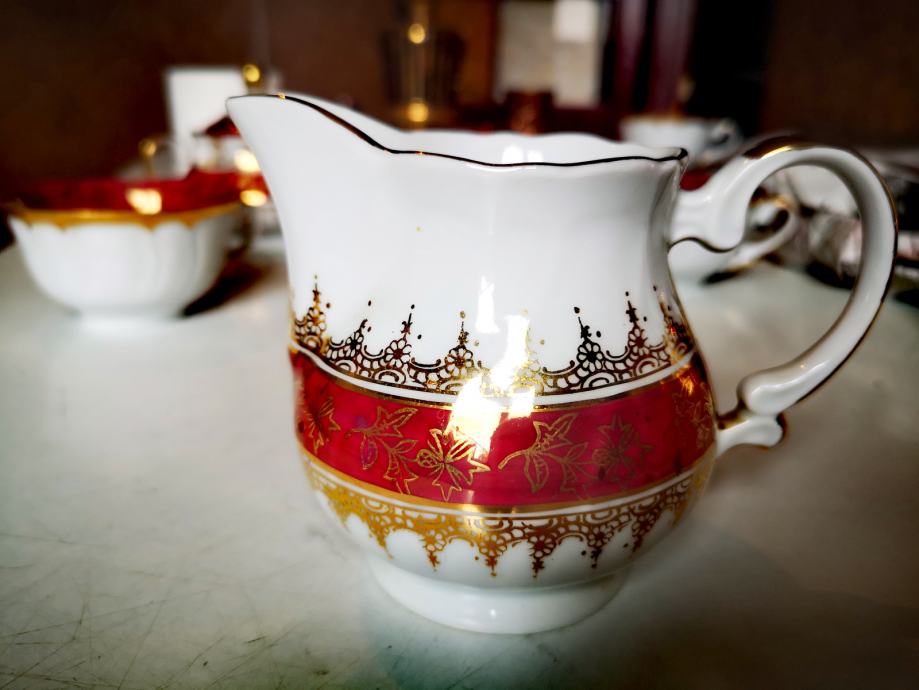 Set sadrži 1 čajanku, 1 posudu za šećer, 1 posudu za mlijeko, 5 šalica i 5 tanjurića.