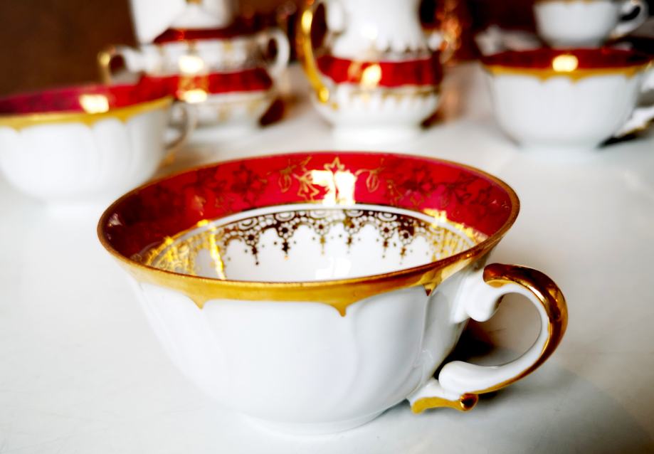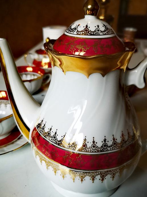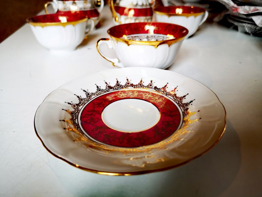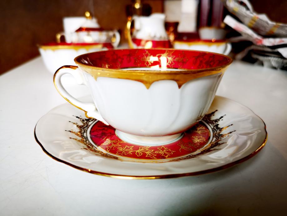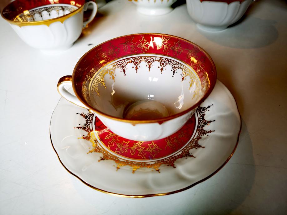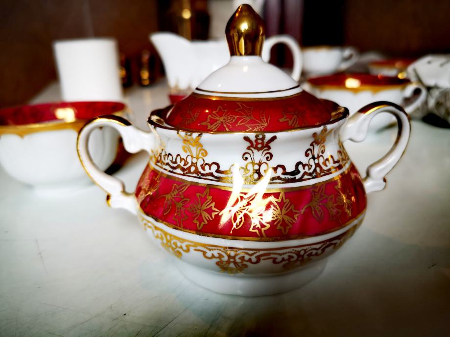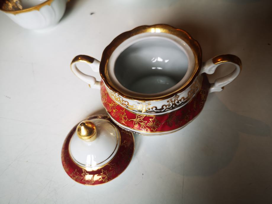 Set sadrži 1 čajanku, 1 posudu za šećer, 1 posudu za mlijeko, 5 šalica i 5 tanjurića.