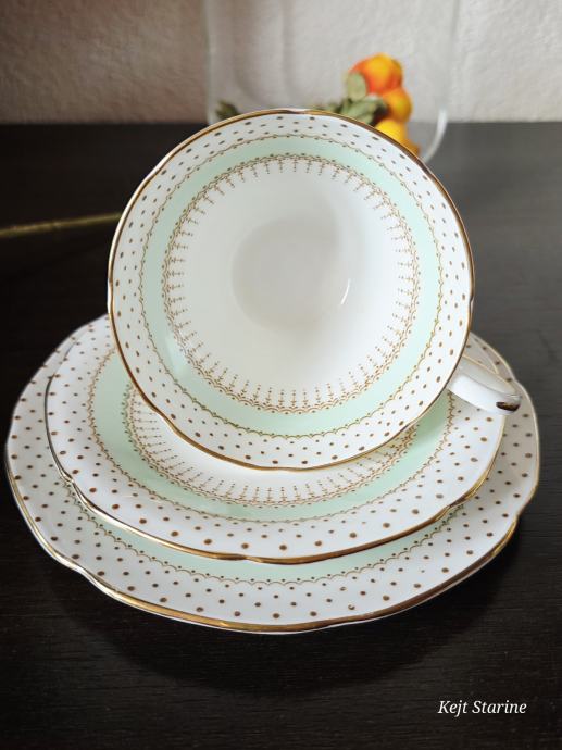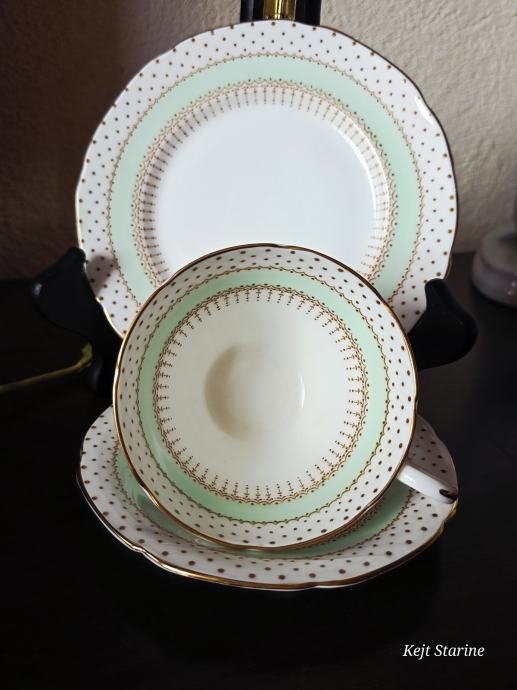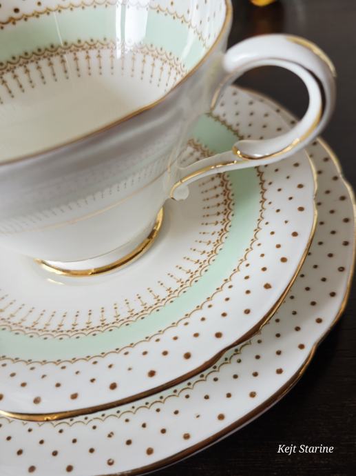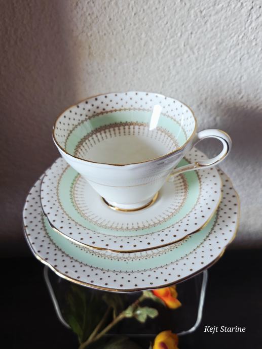 Tris, identificiran je kao vintage Paragon porculan, vjerojatno proizveden između 1939. i 1949. godine. Karakterizira ga menta zelena pruga sa zlatnim točkicama i bogatim pozlaćenim rubovima.