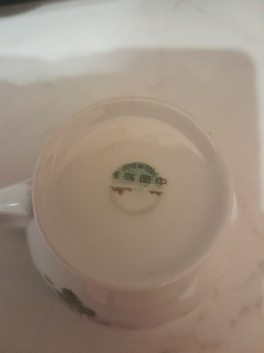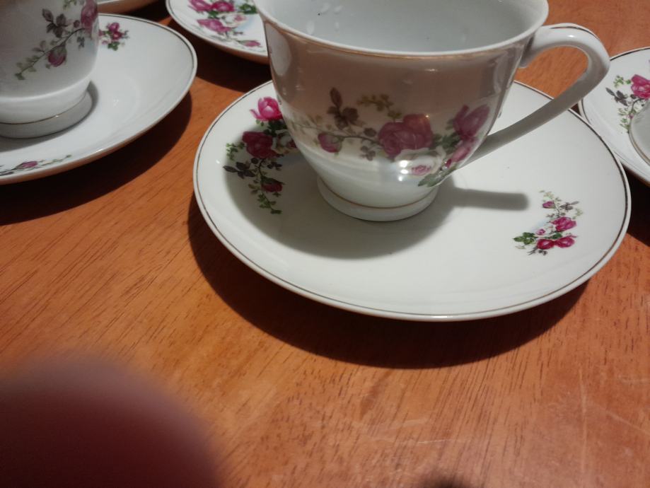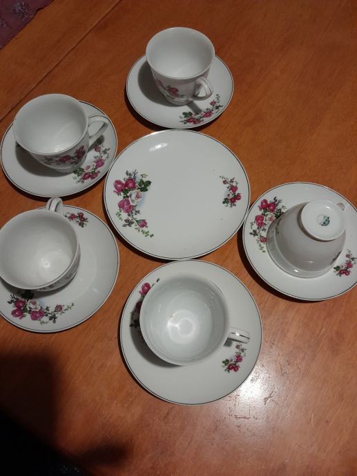 Pet šalica s pripadajućim tanjurima i jedan veći tanja.