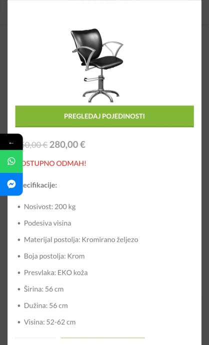 Prodajem rabljene podesive profesionalne stolice za frizerski salon. Materijal od kroma, presvlaka eko koža, nosivost do 200kg. Cijena po komadu 100€ u kompletu sve 3 stolice po 80,00€/komad.