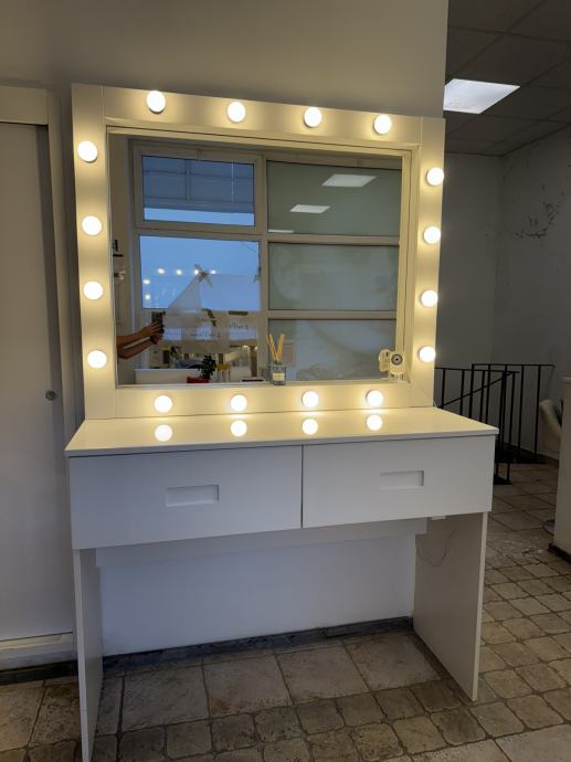 Ogledalo za šminkanje s pultom i dvije duboke ladice, rabljeno i očuvano, Žarulje su spojene žicom za stol, ispod kojeg su prekidači za posebno paljenje svakog reda, a ima i utičnicu za fen, peglu i ostalo. Materijal je bijeli lakril visokog sjaja.