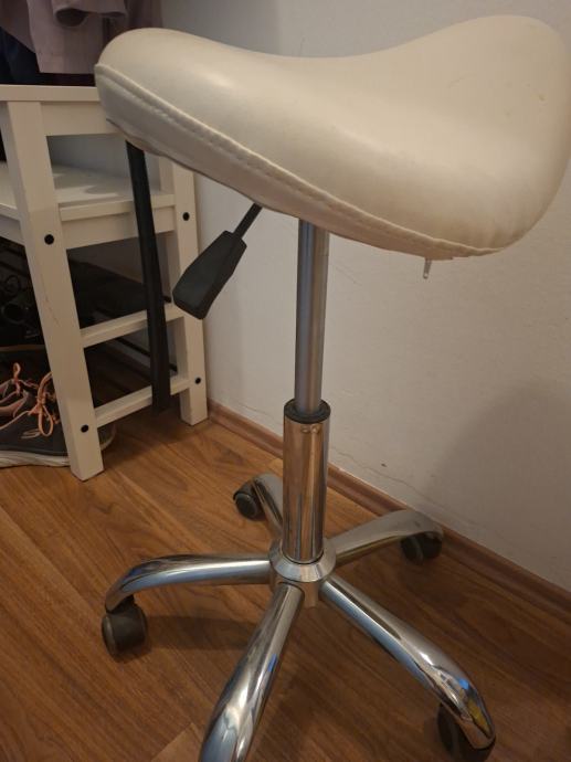 Profesionalna stolica za salone, "kozlić" sjedalo automatski ravna leđa, podesiva visina, navlaka sa sjedala se može skinuti radi pranja i održavanja. U odličnom stanju i funkcionalnosti