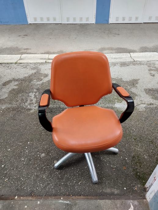 Prodajem profesionalnu opremu za salon - set salonskih stolica i bazen za pranje kose. Stolice su narančaste boje s crnim rukohvatima, obložene umjetnom kožom, na metalnoj podlozi s kotačićima za lako pomicanje. Bazen za pranje je u tamno plavoj boji, keramički, namijenjen za korištenje u kombinaciji sa stolicom. Oprema je funkcionalna i pogodna za frizerske ili kozmetičke salone. Rabljeno, u dobro stanju
