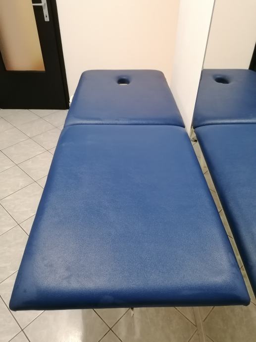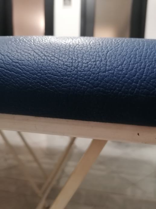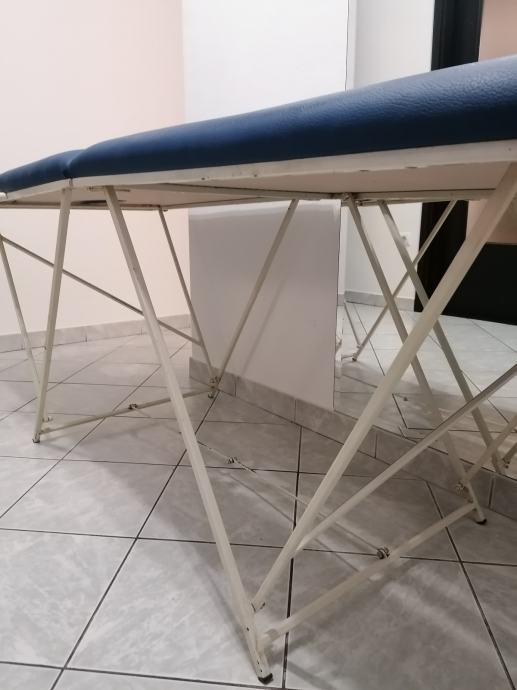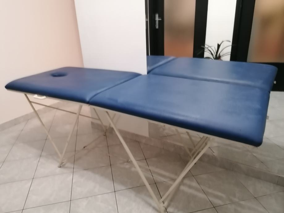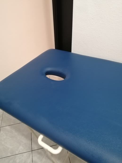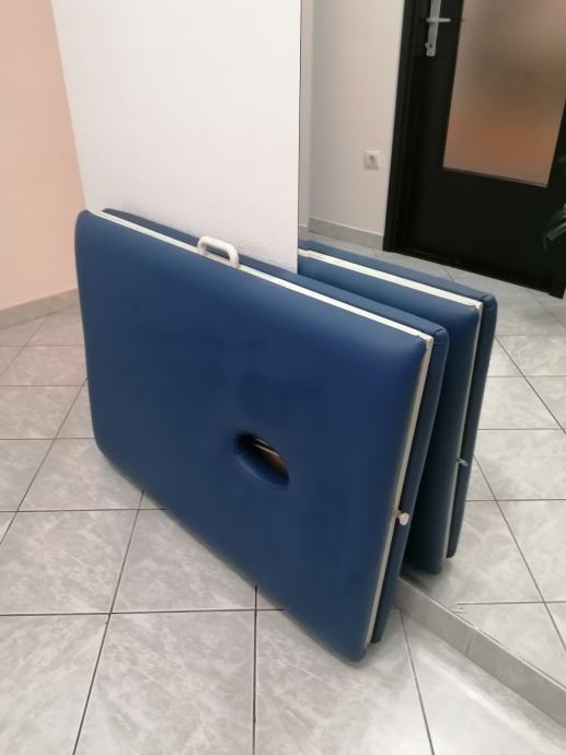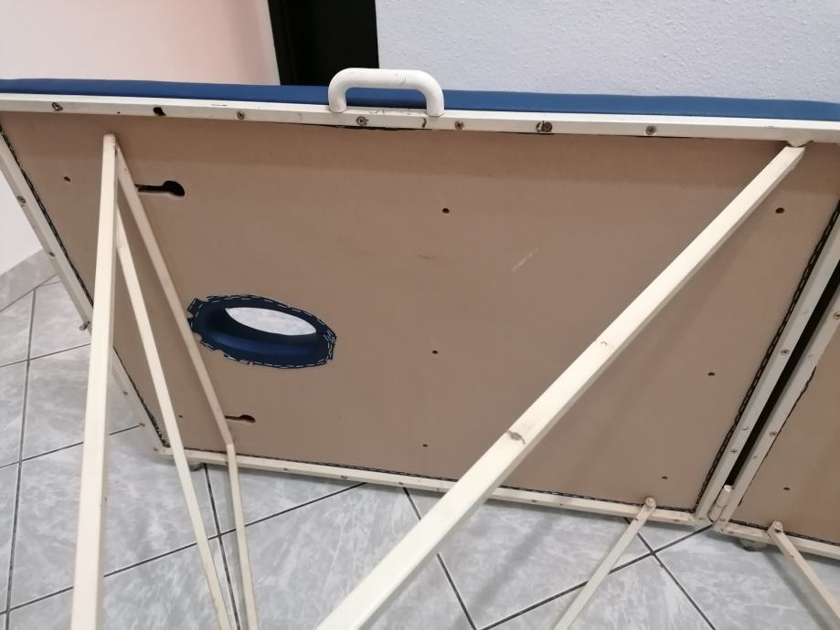 Prenosni stol za masažu sa rupom za glavu. Podloga je puno drvo, na njoj je spuzva debljine 5 cm, i presvucen sa cvrstom umjetnom kožom. Noge su napravljene od profila tako da stol moze izdrzati i do 200 kg.
