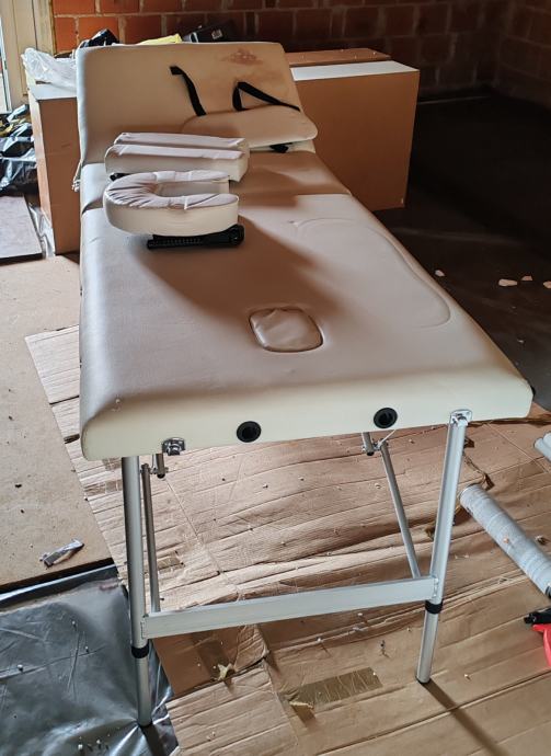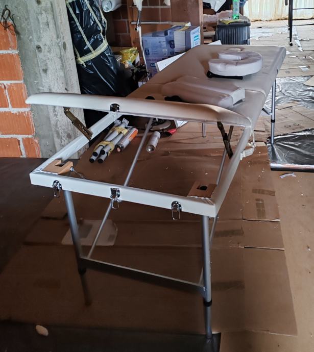 Sklopivi prijenosni stol za masažu u potpuno ispravnom stanju sa nastavcima, ima samo fleku na jednom dijelu, bez ikakvih oštećenja.