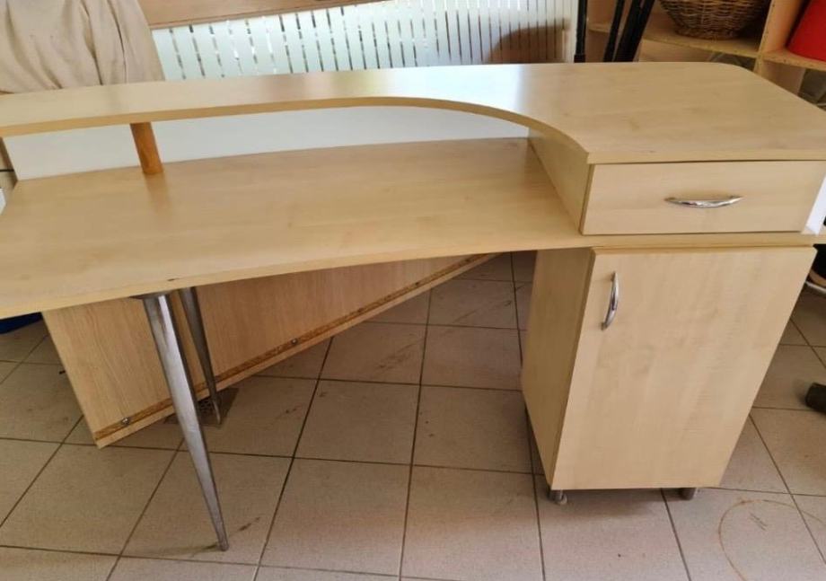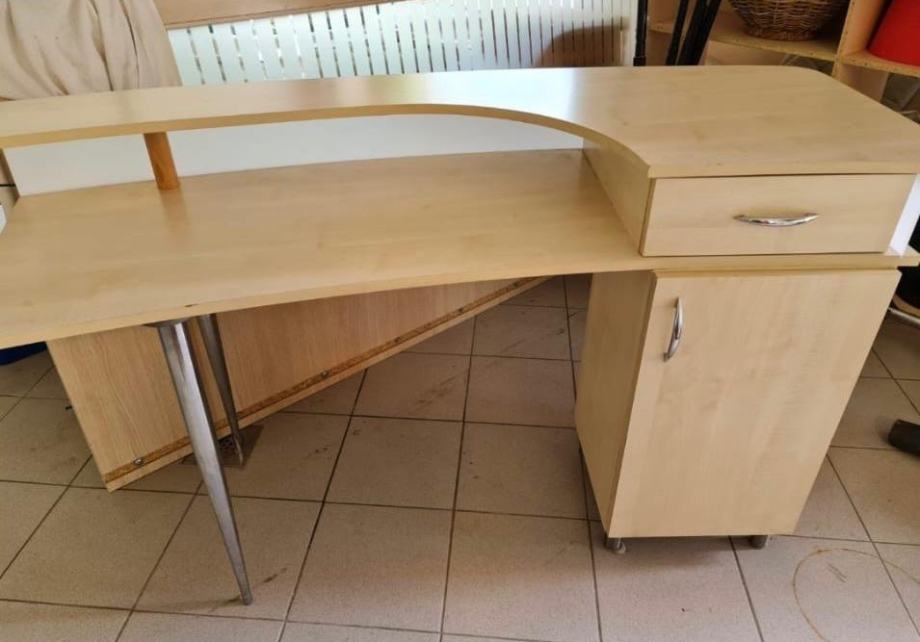 Dva drvena stola u natur boji blago zaobljena idealno prilagođena tijelu za vrijeme uredskog posla, informatičara, manikure i slično. Svojom neutralnom bojom idealno se uklapa u svaki prostor. Sa desne strane stola nalazi se ladičar koji omogućava brzu dostupnost svim potrebnim alatima i stvarima da nisu izloženi na radnoj plohi te ispod ladice je ormarić sa dvije pregrade što omogućava dodatni skladišni prostor.