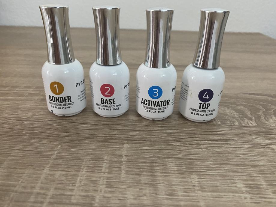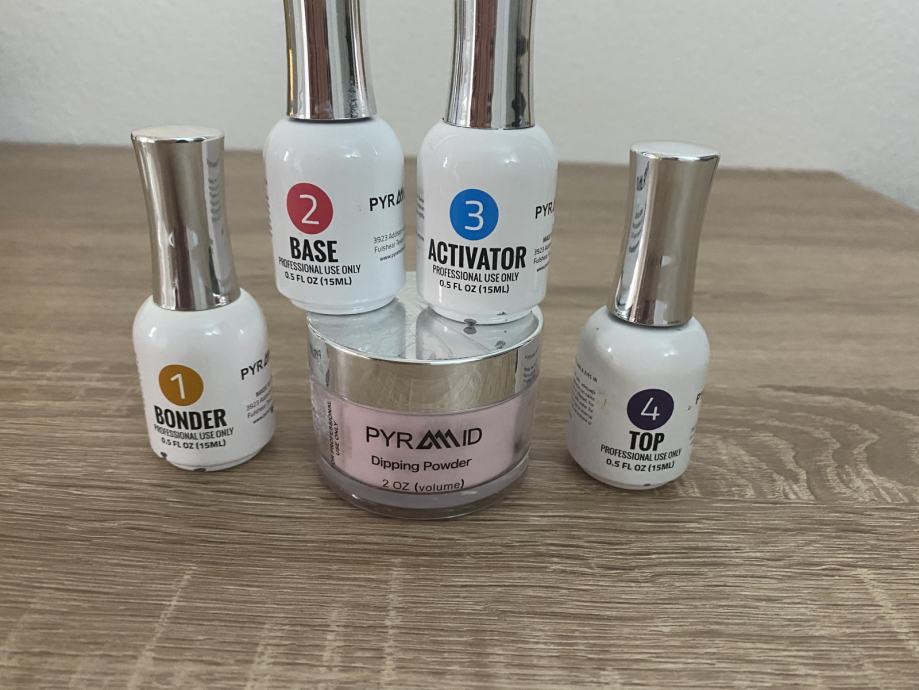 Prodajem novi set pyramid praha sa odgovarajucim aplikatorima za rad na noktima. Dobije se pyramid prah,bonder,base,activator i top sjaj.