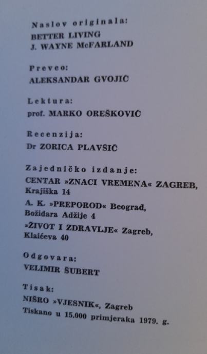 J. Wayne McFarland "Bolje živjeti", zajedničko izdanje Centar "Znaci vremena", Zagreb, A. K. "Preporod", Beograd, "Život i zdravlje", Zagreb, 1979. Teme i sadržaj dostupni na slikama.