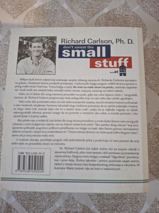 Dr. Richard Carlson: NE MARI ZA MALE STVARI NA POSLU (100 savjeta kako ne dopustiti da stres na radnom mjestu zavlada vašim životom), izdavač Algoritam, meki uvez, 290 stranica, u dobrom stanju, cijena 5 EUR. Ne prodajem preko PayProtect. Info na 0917912699.
