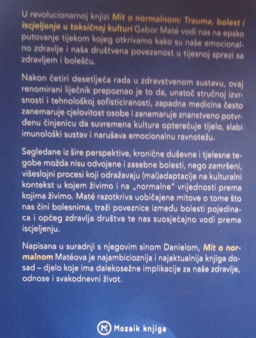 Dr. Maté, na temelju znanstvenih istraživanja i desetljeća kliničkog iskustva, povezuje traumu, bolest i društvene norme te postavlja ključno pitanje: Jesmo li doista bolesni ili smo se prilagodili bolesnom sustavu?