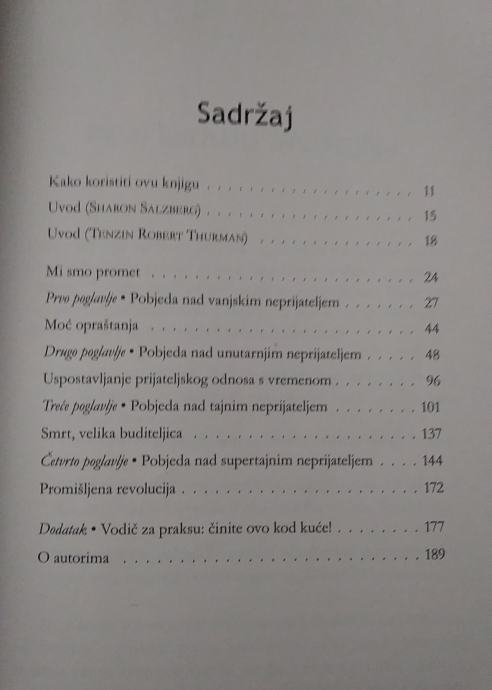 U ovoj knjizi autori crpe iz mnogih duhovnih tradicija, ali i iz suvremene psihologije kako bi predstavili oruđa koja će svima pomoći u nastojanju promjene odnosa prema vlastitim neprijateljima i učenju kako živjeti život vođen mudrošću, tolerancijom, suosjećanjem i ljubavlju.