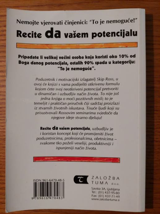 Pripadate li velikoj većini osoba koja koristi oko 10% od Boga danog potencijala, ostalih 90% spada u kategoriju: "To je nemoguće". Poduzetnik i motivacijski izlagatelj Skip Ross, u ovoj će knjizi s vama podijeliti otkriven u formulu kojom ćete svoj neotkriveni potencijal pretvoriti u dinamičan i uzbudljiv način života. To nije još jedna knjiga o moći pozitivnih misli; to je temeljit i praktičan priručnik čiji sadržaj proizlazi iz stvarnih životnih iskustava. Tisuće ljudi koji su prisustvovali Rossovim seminarima svjedoče da njegove ideje stvarno djeluju!
