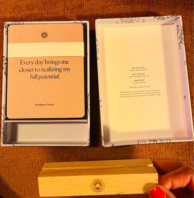Set sadrži 52 kartice s afirmacijama i drveni stalak.