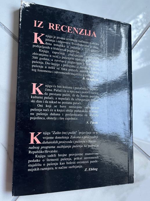 Iz recenzija: ” Knjiga je pisana izvornim načinom u obliku pitanja i odgovora. Sveobuhvatno je obrađena tematika o pušenju s 515 pitanja podijeljenih u tridesetak poglavlja. Knjiga započinje značajnim povijesnim zbivanjima u vezi s pušenjem tijekom posljednjih 500 godina, a završava poglavljem o budućnosti pušenja. Dio knjige s prilozima iz dnevnog tiska o pušenju u neku su ruku potvrda autorovih opisa tog fenomena i suvremenih stajališta o pušenju.”